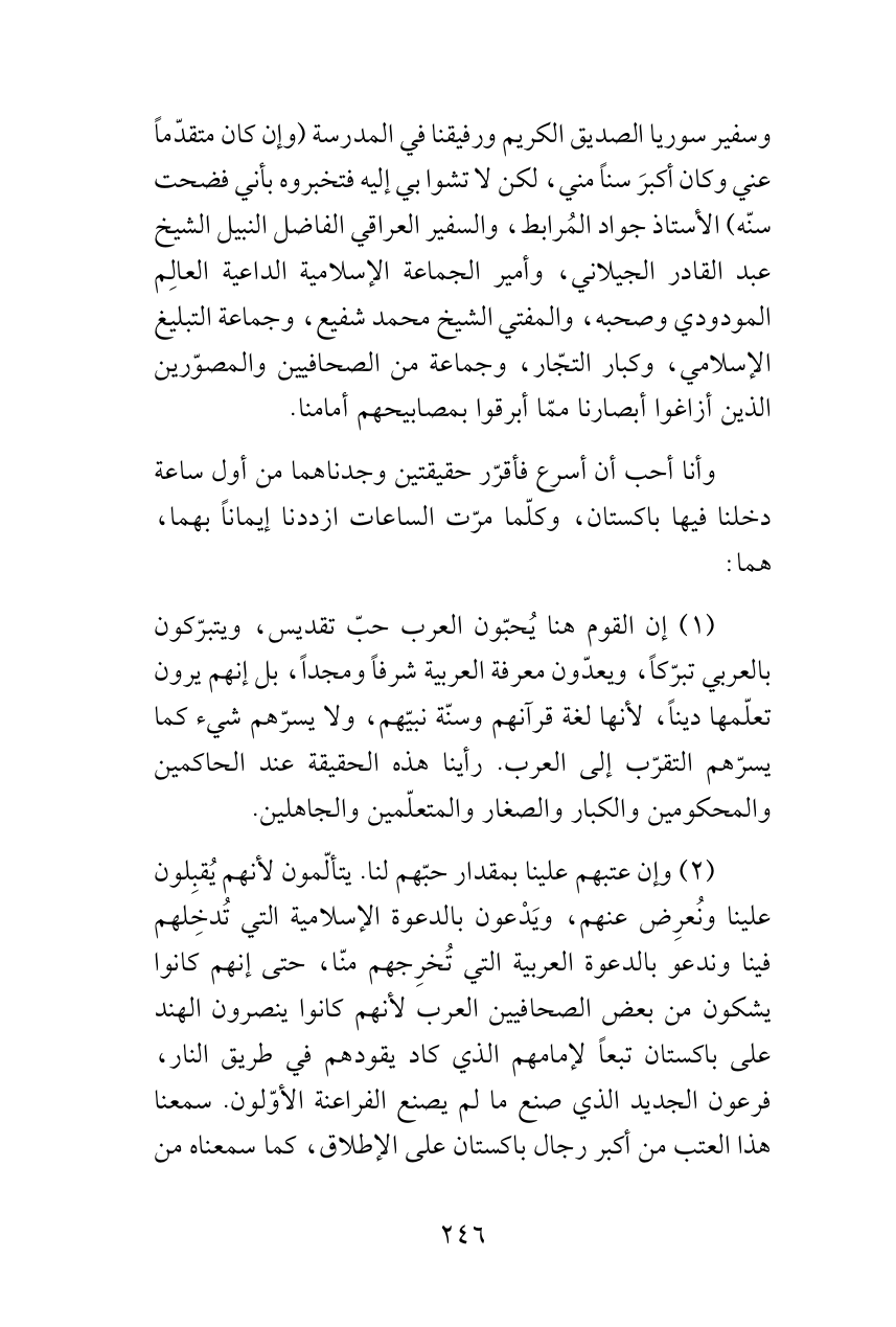 (2) وإن عتبهم علينا بمقدار حبّهم لنا. يتألّمون لأنهم يُقبِلون علينا ونُعرِض عنهم، ويَدْعون بالدعوة الإسلامية التي تُدخِلهم فينا وندعو بالدعوة العربية التي تُخرِجهم منّا، حتى إنهم كانوا يشكون من بعض الصحافيين العرب لأنهم كانوا ينصرون الهند على باكستان تبعاً لإمامهم الذي كاد يقودهم في طريق النار، فرعون الجديد الذي صنع ما لم يصنع الفراعنة الأوّلون. سمعنا هذا العتب من أكبر رجال باكستان على الإطلاق، كما سمعناه من