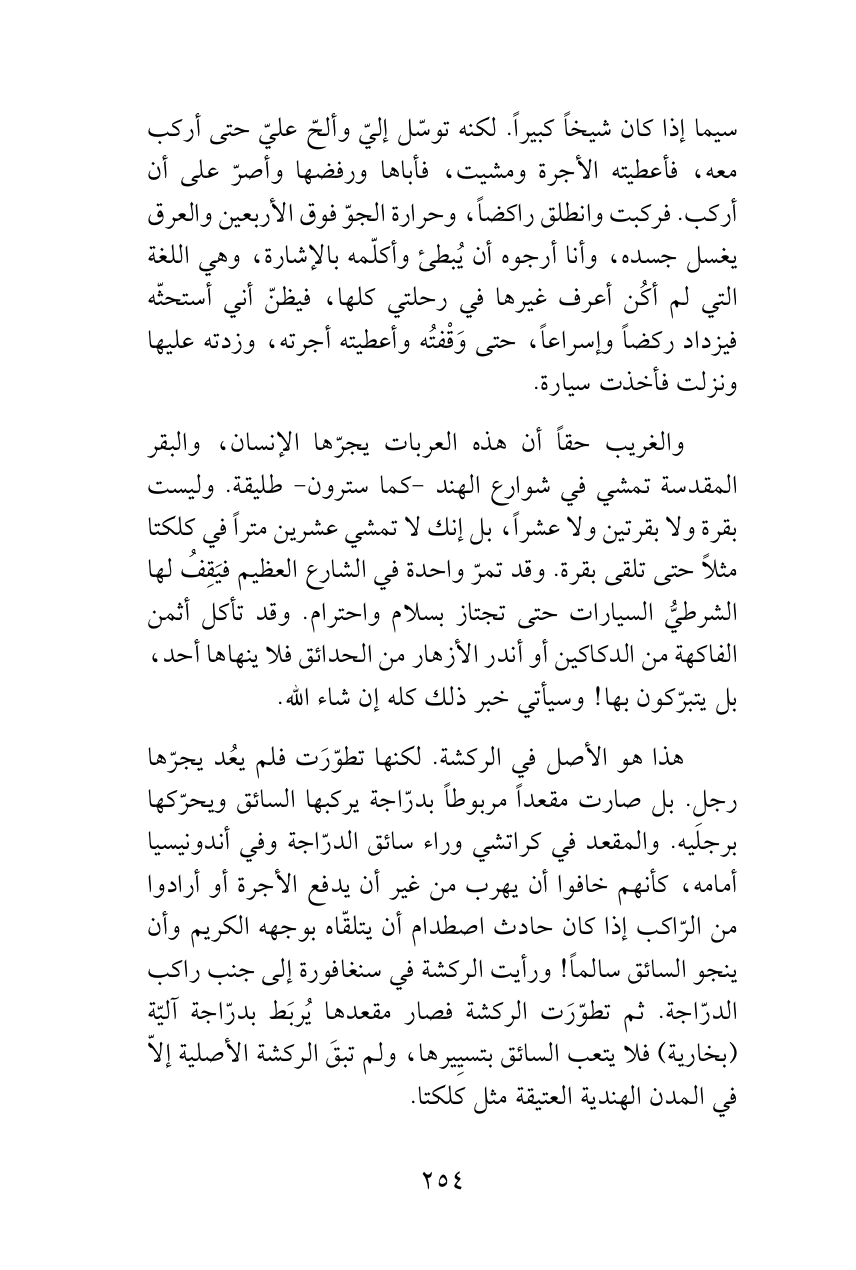 سيما إذا كان شيخاً كبيراً. لكنه توسّل إليّ وألحّ عليّ حتى أركب معه، فأعطيته الأجرة ومشيت، فأباها ورفضها وأصرّ على أن أركب. فركبت وانطلق راكضاً، وحرارة الجوّ فوق الأربعين والعرق يغسل جسده، وأنا أرجوه أن يُبطئ وأكلّمه بالإشارة، وهي اللغة التي لم أكُن أعرف غيرها في رحلتي كلها، فيظنّ أني أستحثّه فيزداد ركضاً وإسراعاً، حتى وَقْفتُه وأعطيته أجرته، وزدته عليها ونزلت فأخذت سيارة.