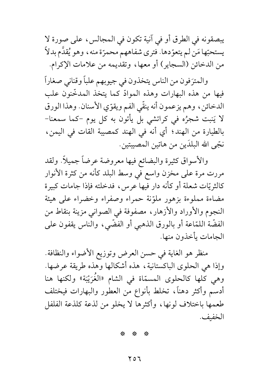 منظر هو الغاية في حسن العرض وتوزيع الأضواء والنظافة. وإذا هي الحلوى الباكستانية، هذه أشكالها وهذه طريقة عرضها. وهي كلها كالحلوى المسمّاة في الشام «الغُرَيْبَة» ولكنها هنا أدسم وأكثر دهناً، تخلط بأنواع من العطور والبهارات فيختلف طعمها باختلاف لونها، وأكثرها لا يخلو من لذعة كلذعة الفلفل الخفيف.