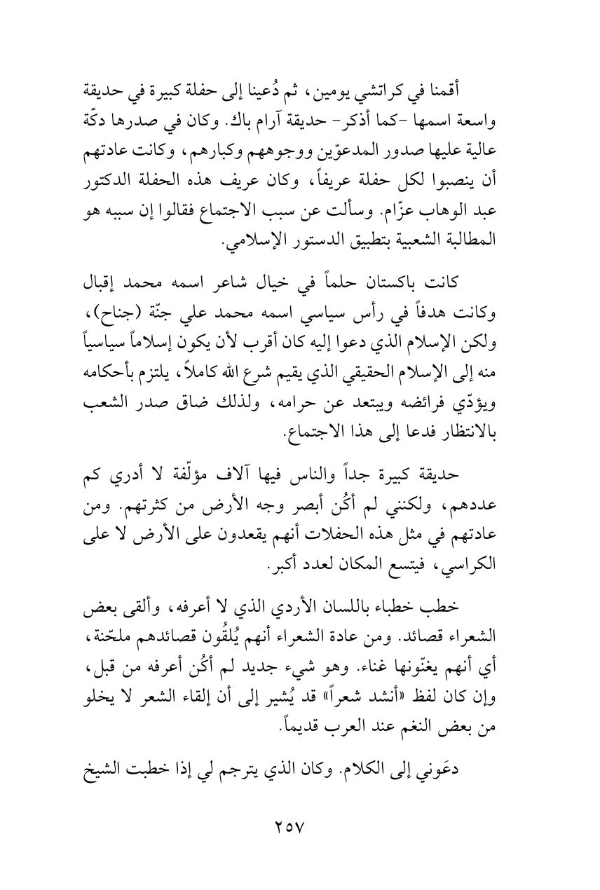 أقمنا في كراتشي يومين، ثم دُعينا إلى حفلة كبيرة في حديقة واسعة اسمها -كما أذكر- حديقة آرام باك. وكان في صدرها دكّة عالية عليها صدور المدعوّين ووجوههم وكبارهم، وكانت عادتهم أن ينصبوا لكل حفلة عريفاً، وكان عريف هذه الحفلة الدكتور عبد الوهاب عزّام. وسألت عن سبب الاجتماع فقالوا إن سببه هو المطالبة الشعبية بتطبيق الدستور الإسلامي.