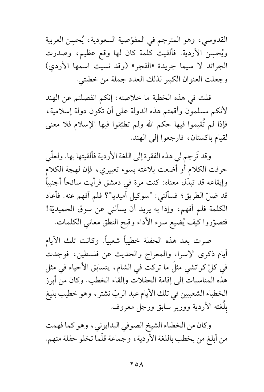 القدوسي، وهو المترجم في المفوّضية السعودية، يُحسِن العربية ويُحسِن الأردية. فألقيت كلمة كان لها وقع عظيم، وصدرت الجرائد لا سيما جريدة «الفجر» (وقد نسيت اسمها الأردي) وجعلت العنوان الكبير لذلك العدد جملة من خطبتي.
