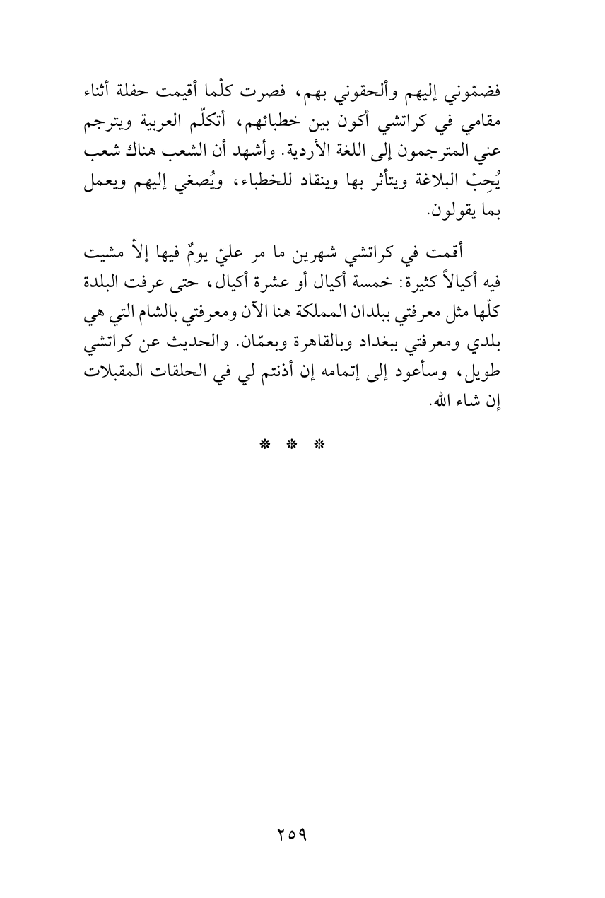 أقمت في كراتشي شهرين ما مر عليّ يومٌ فيها إلاّ مشيت فيه أكيالاً كثيرة: خمسة أكيال أو عشرة أكيال، حتى عرفت البلدة كلّها مثل معرفتي ببلدان المملكة هنا الآن ومعرفتي بالشام التي هي بلدي ومعرفتي ببغداد وبالقاهرة وبعمّان. والحديث عن كراتشي طويل، وسأعود إلى إتمامه إن أذنتم لي في الحلقات المقبلات إن شاء الله.