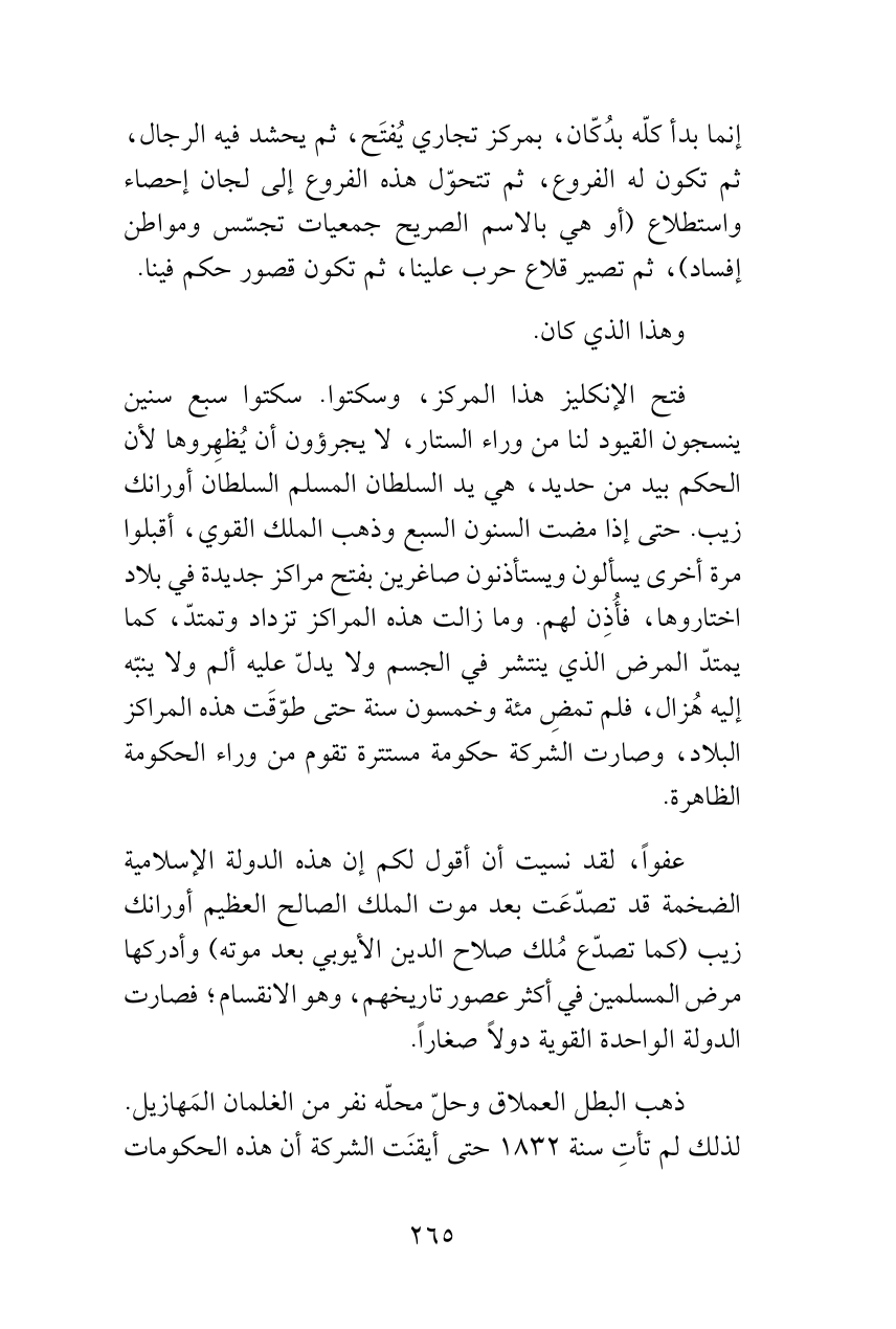 فتح الإنكليز هذا المركز، وسكتوا. سكتوا سبع سنين ينسجون القيود لنا من وراء الستار، لا يجرؤون أن يُظهِروها لأن الحكم بيد من حديد، هي يد السلطان المسلم السلطان أورانك زيب. حتى إذا مضت السنون السبع وذهب الملك القوي، أقبلوا مرة أخرى يسألون ويستأذنون صاغرين بفتح مراكز جديدة في بلاد اختاروها، فأُذِن لهم. وما زالت هذه المراكز تزداد وتمتدّ، كما يمتدّ المرض الذي ينتشر في الجسم ولا يدلّ عليه ألم ولا ينبّه إليه هُزال، فلم تمضِ مئة وخمسون سنة حتى طوّقَت هذه المراكز البلاد، وصارت الشركة حكومة مستترة تقوم من وراء الحكومة الظاهرة.