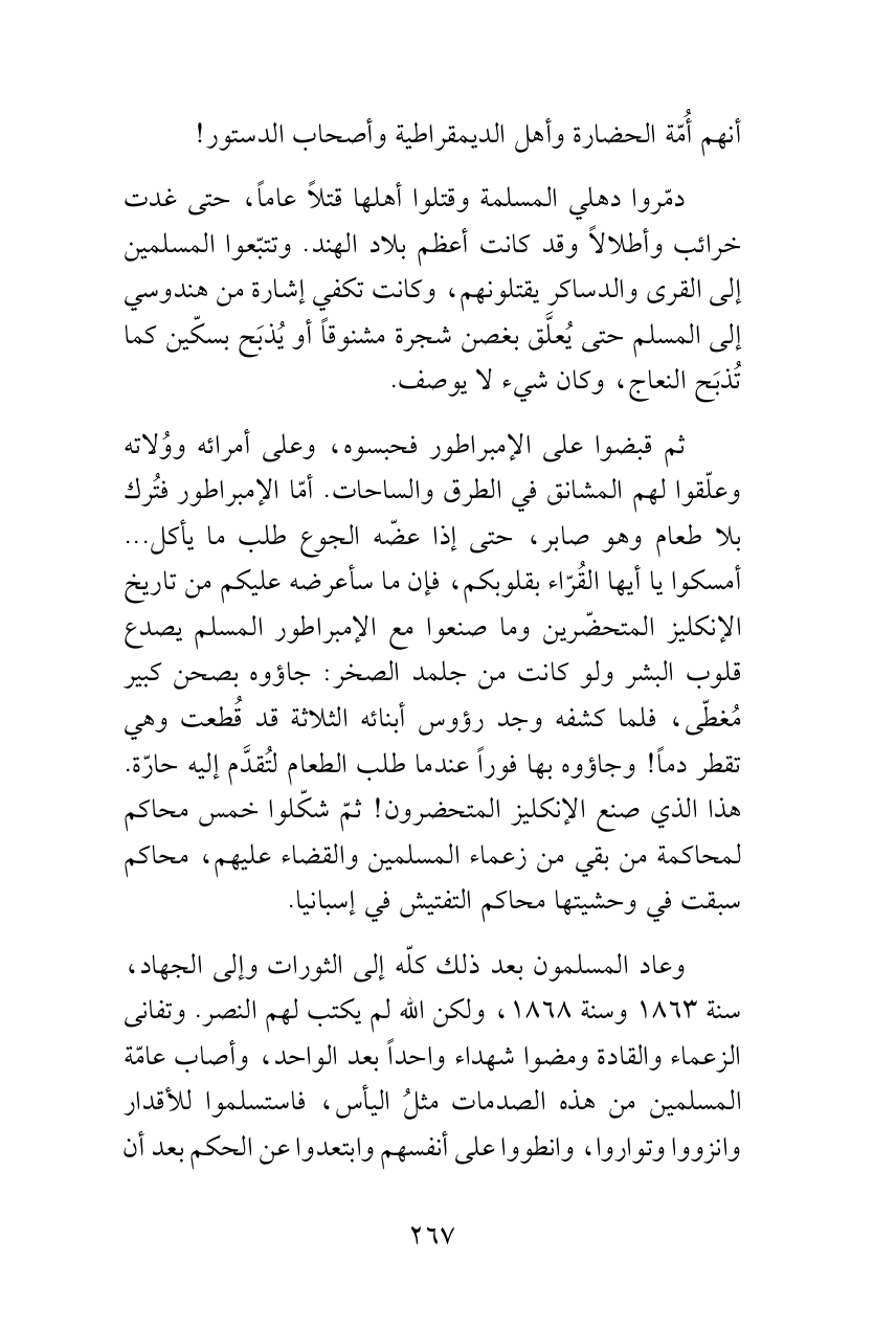ثم قبضوا على الإمبراطور فحبسوه، وعلى أمرائه ووُلاته وعلّقوا لهم المشانق في الطرق والساحات. أمّا الإمبراطور فتُرك بلا طعام وهو صابر، حتى إذا عضّه الجوع طلب ما يأكل ... أمسكوا يا أيها القُرّاء بقلوبكم، فإن ما سأعرضه عليكم من تاريخ الإنكليز المتحضّرين وما صنعوا مع الإمبراطور المسلم يصدع قلوب البشر ولو كانت من جلمد الصخر: جاؤوه بصحن كبير مُغطّى، فلما كشفه وجد رؤوس أبنائه الثلاثة قد قُطعت وهي تقطر دماً! وجاؤوه بها فوراً عندما طلب الطعام لتُقدَّم إليه حارّة. هذا الذي صنع الإنكليز المتحضرون! ثمّ شكّلوا خمس محاكم لمحاكمة من بقي من زعماء المسلمين والقضاء عليهم، محاكم سبقت في وحشيتها محاكم التفتيش في إسبانيا.