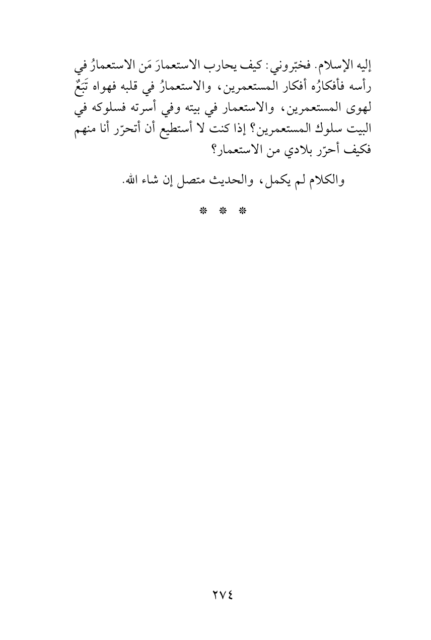 إليه الإسلام. فخبّروني: كيف يحارب الاستعمارَ مَن الاستعمارُ في رأسه فأفكارُه أفكار المستعمرين، والاستعمارُ في قلبه فهواه تَبَعٌ لهوى المستعمرين، والاستعمار في بيته وفي أسرته فسلوكه في البيت سلوك المستعمرين؟ إذا كنت لا أستطيع أن أتحرّر أنا منهم فكيف أحرّر بلادي من الاستعمار؟