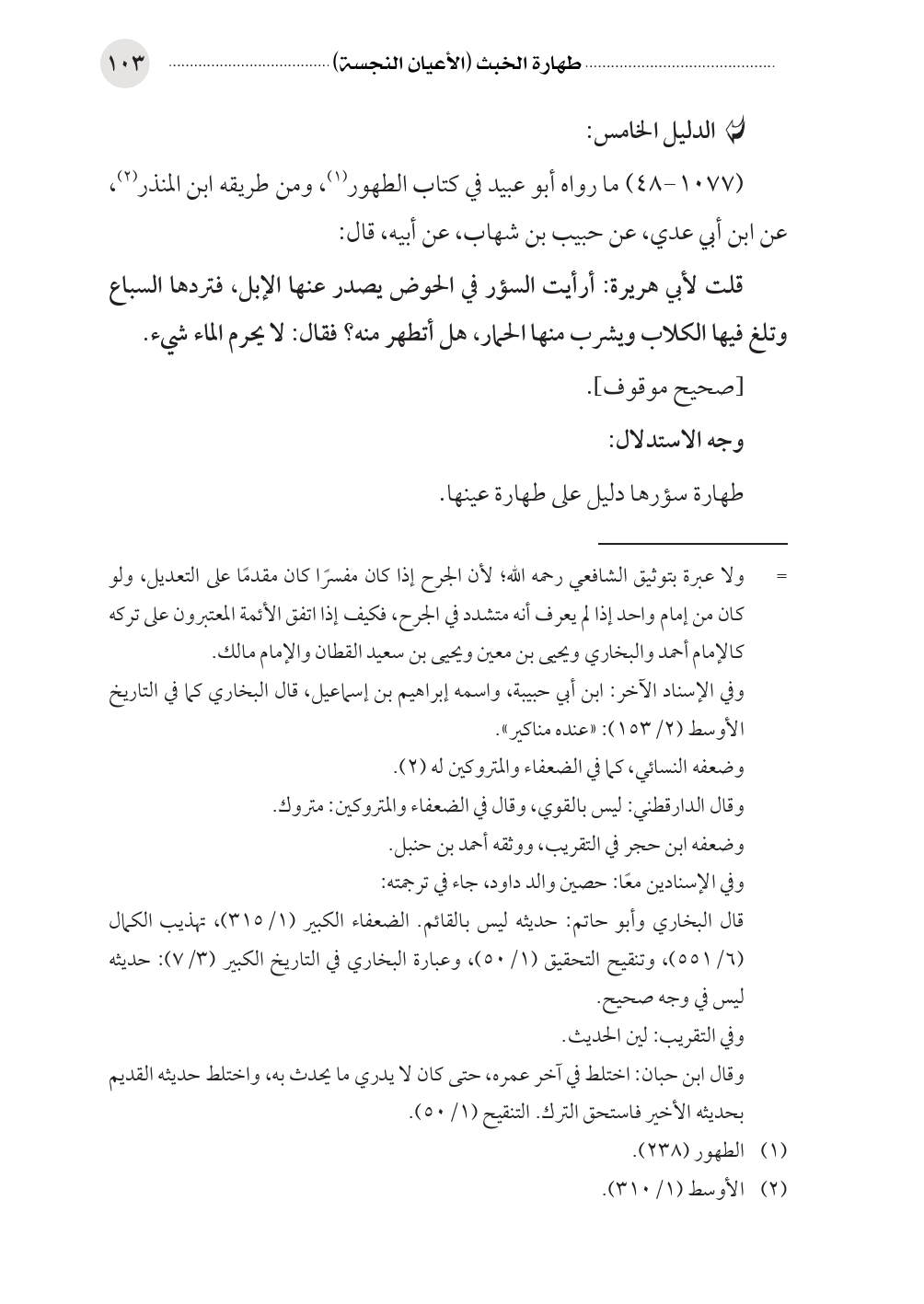 (١٠٧٧ - ٤٨) ما رواه أبو عبيد في كتاب الطهور (¬١)، ومن طريقه ابن المنذر (¬٢)، عن ابن أبي عدي، عن حبيب بن شهاب، عن أبيه، قال: قلت لأبي هريرة: أرأيت السؤر في الحوض يصدر عنها الإبل، فتردها السباع وتلغ فيها الكلاب ويشرب منها الحمار، هل أتطهر منه؟ فقال: لا يحرم الماء شيء.