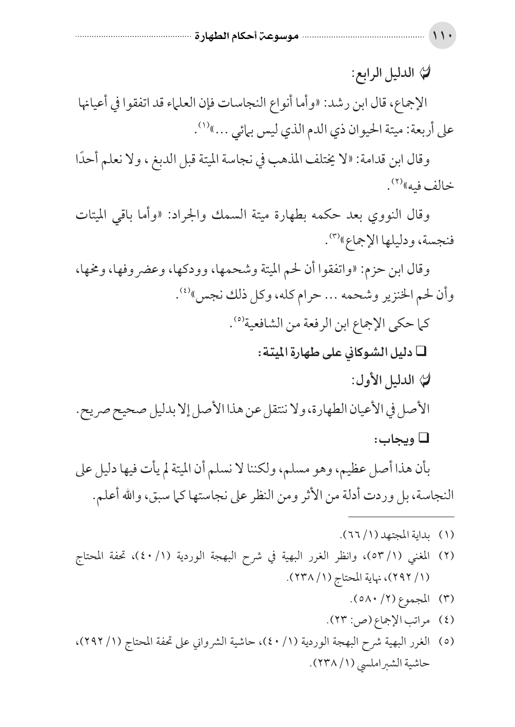 الإجماع، قال ابن رشد: «وأما أنواع النجاسات فإن العلماء قد اتفقوا في أعيانها على أربعة: ميتة الحيوان ذي الدم الذي ليس بمائي ... » (¬١).