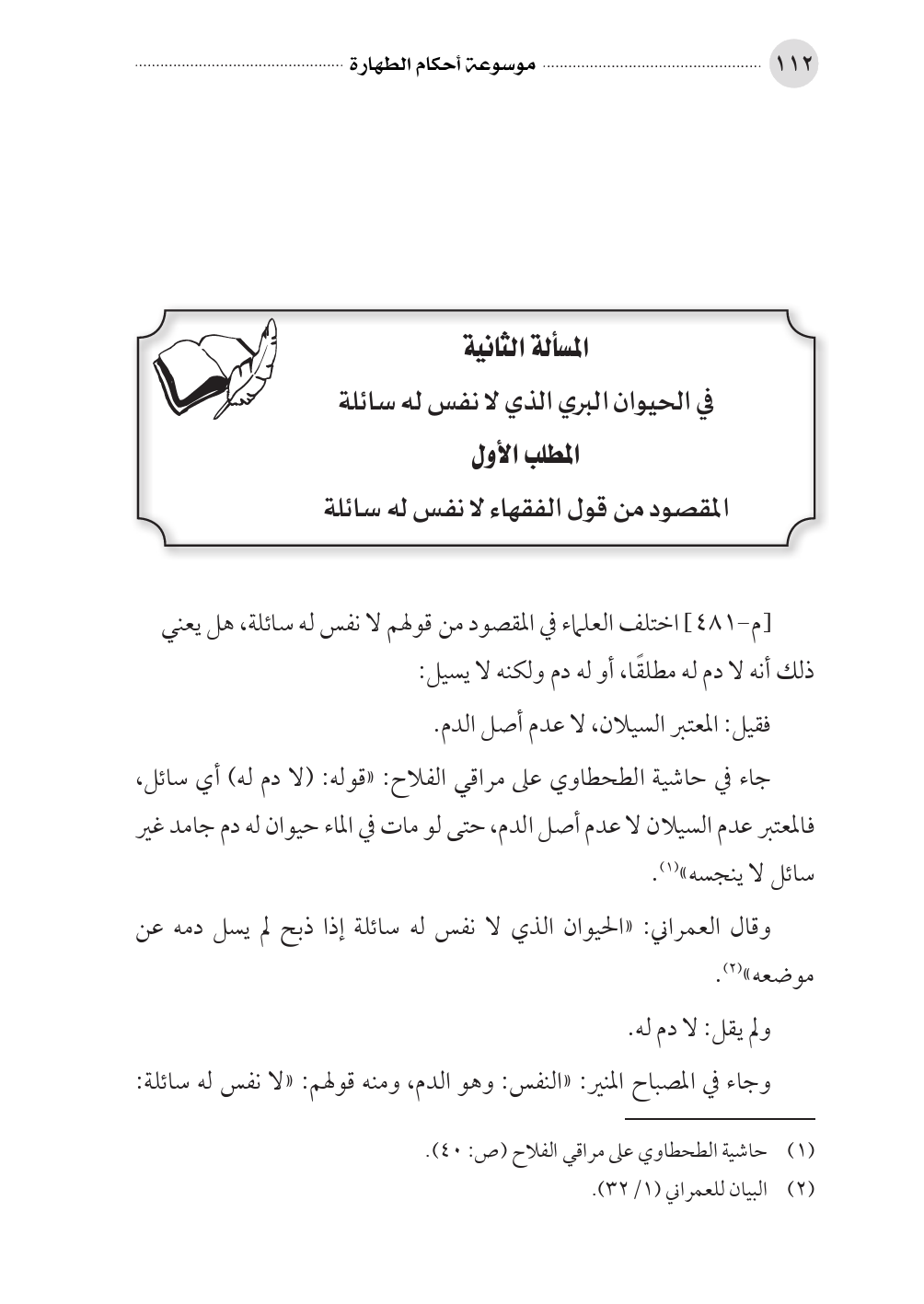 [م-٤٨١] اختلف العلماء في المقصود من قولهم لا نفس له سائلة، هل يعني ذلك أنه لا دم له مطلقًا، أو له دم ولكنه لا يسيل: