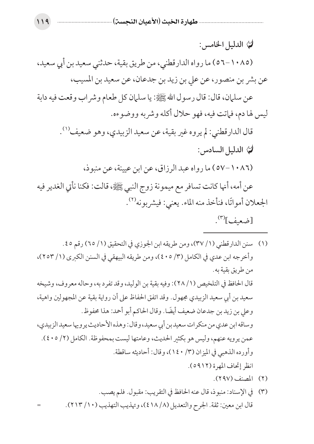 (١٠٨٥ - ٥٦) ما رواه الدارقطني، من طريق بقية، حدثني سعيد بن أبي سعيد، عن بشر بن منصور، عن علي بن زيد بن جدعان، عن سعيد بن المسيب،