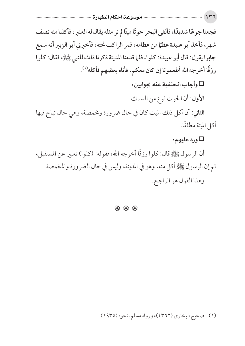 فجعنا جوعًا شديدًا، فألقى البحر حوتًا ميتًا لم نر مثله يقال له العنبر، فأكلنا منه نصف شهر، فأخذ أبو عبيدة عظمًا من عظامه، فمر الراكب تحته، فأخبرني أبو الزبير أنه سمع جابرا يقول: قال أبو عبيدة: كلوا، فلما قدمنا المدينة ذكرنا ذلك للنبي صلى الله عليه وسلم، فقال: كلوا رزقًا أخرجه الله أطعمونا إن كان معكم، فأتاه بعضهم فأكله (¬١).