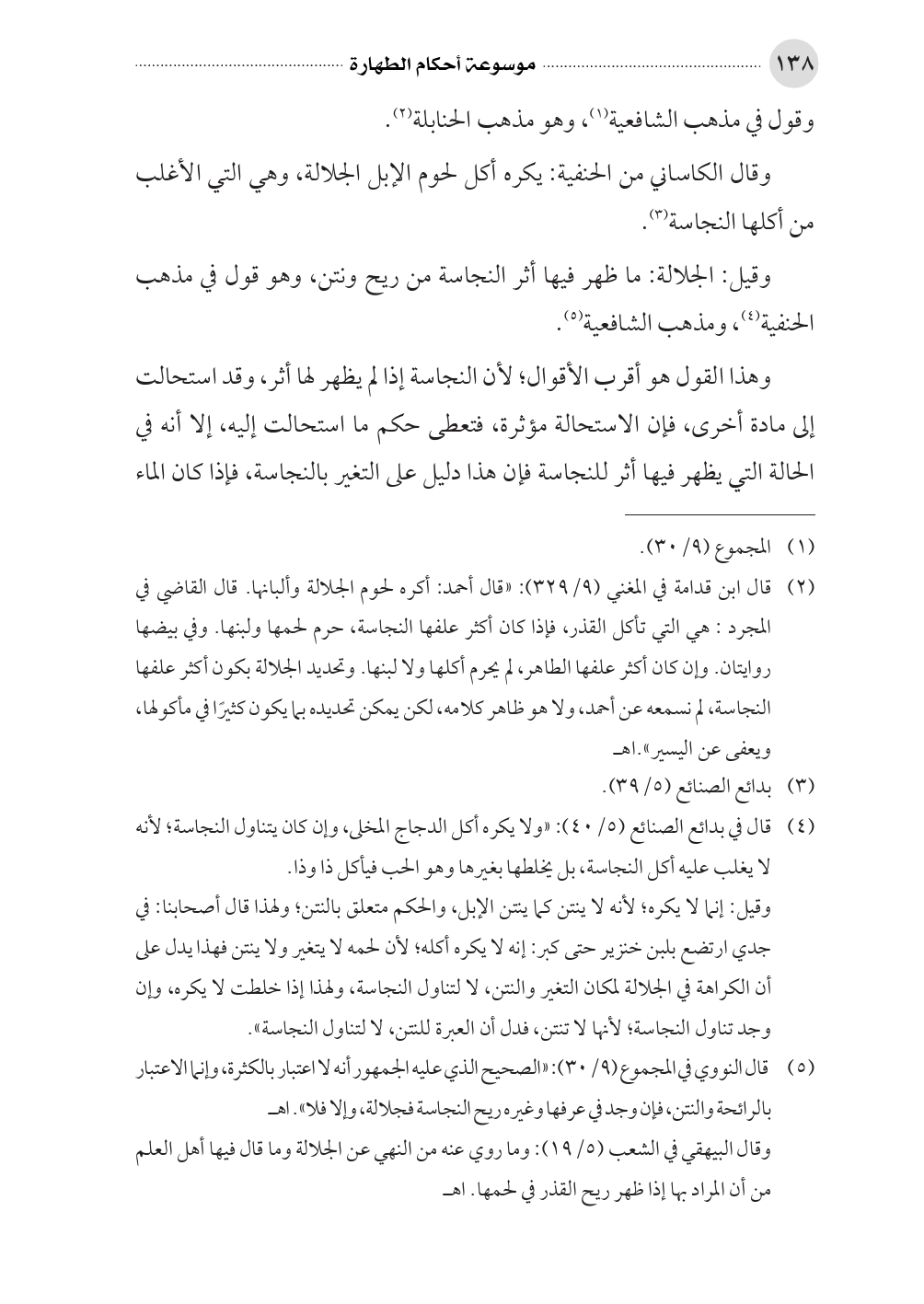 (¬٢) قال ابن قدامة في المغني (٩/ ٣٢٩): «قال أحمد: أكره لحوم الجلالة وألبانها. قال القاضي في المجرد: هي التي تأكل القذر، فإذا كان أكثر علفها النجاسة، حرم لحمها ولبنها. وفي بيضها روايتان. وإن كان أكثر علفها الطاهر، لم يحرم أكلها ولا لبنها. وتحديد الجلالة بكون أكثر علفها النجاسة، لم نسمعه عن أحمد، ولا هو ظاهر كلامه، لكن يمكن تحديده بما يكون كثيرًا في مأكولها، ويعفى عن اليسير».اهـ