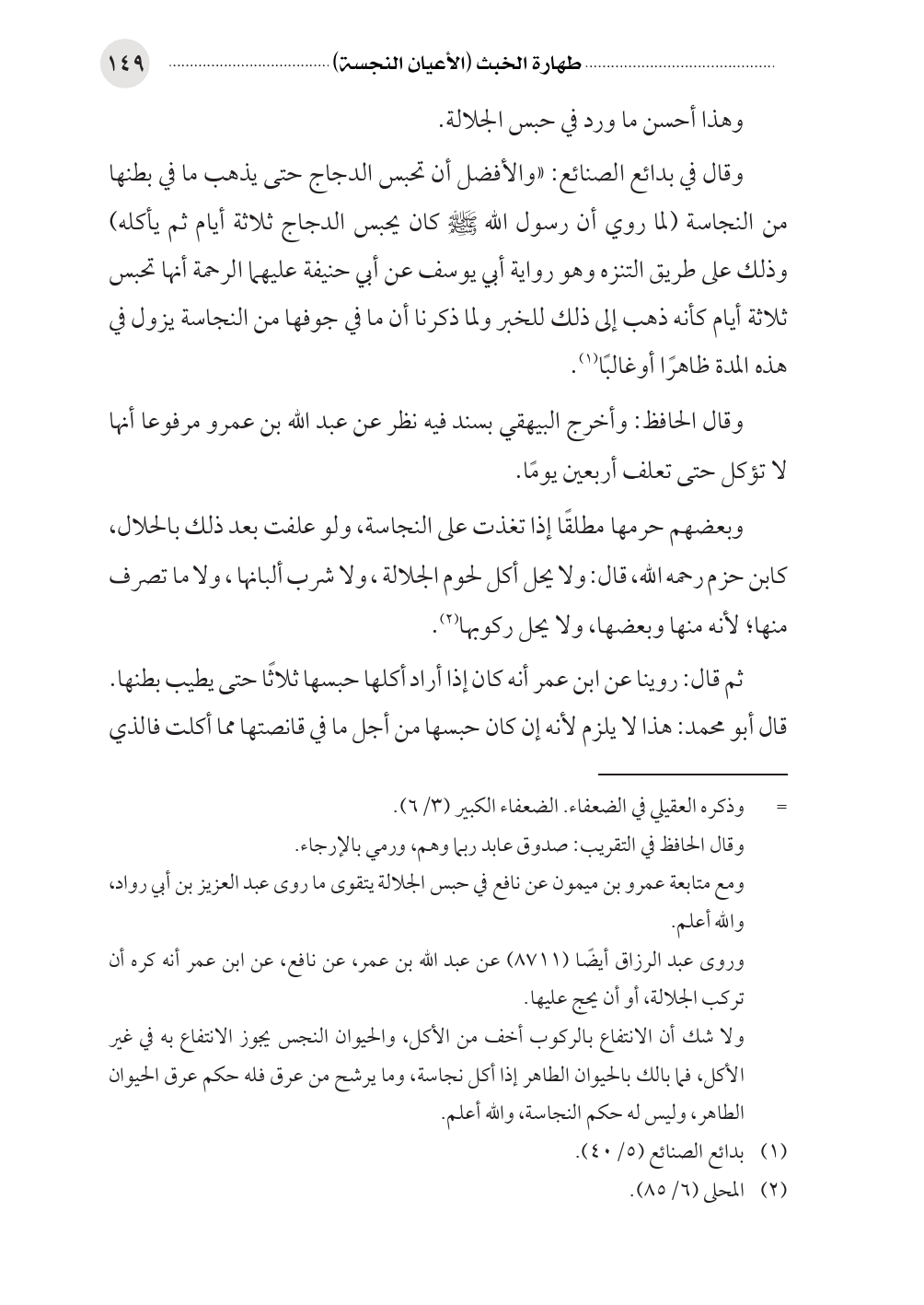 وقال الحافظ: وأخرج البيهقي بسند فيه نظر عن عبد الله بن عمرو مرفوعا أنها لا تؤكل حتى تعلف أربعين يومًا.