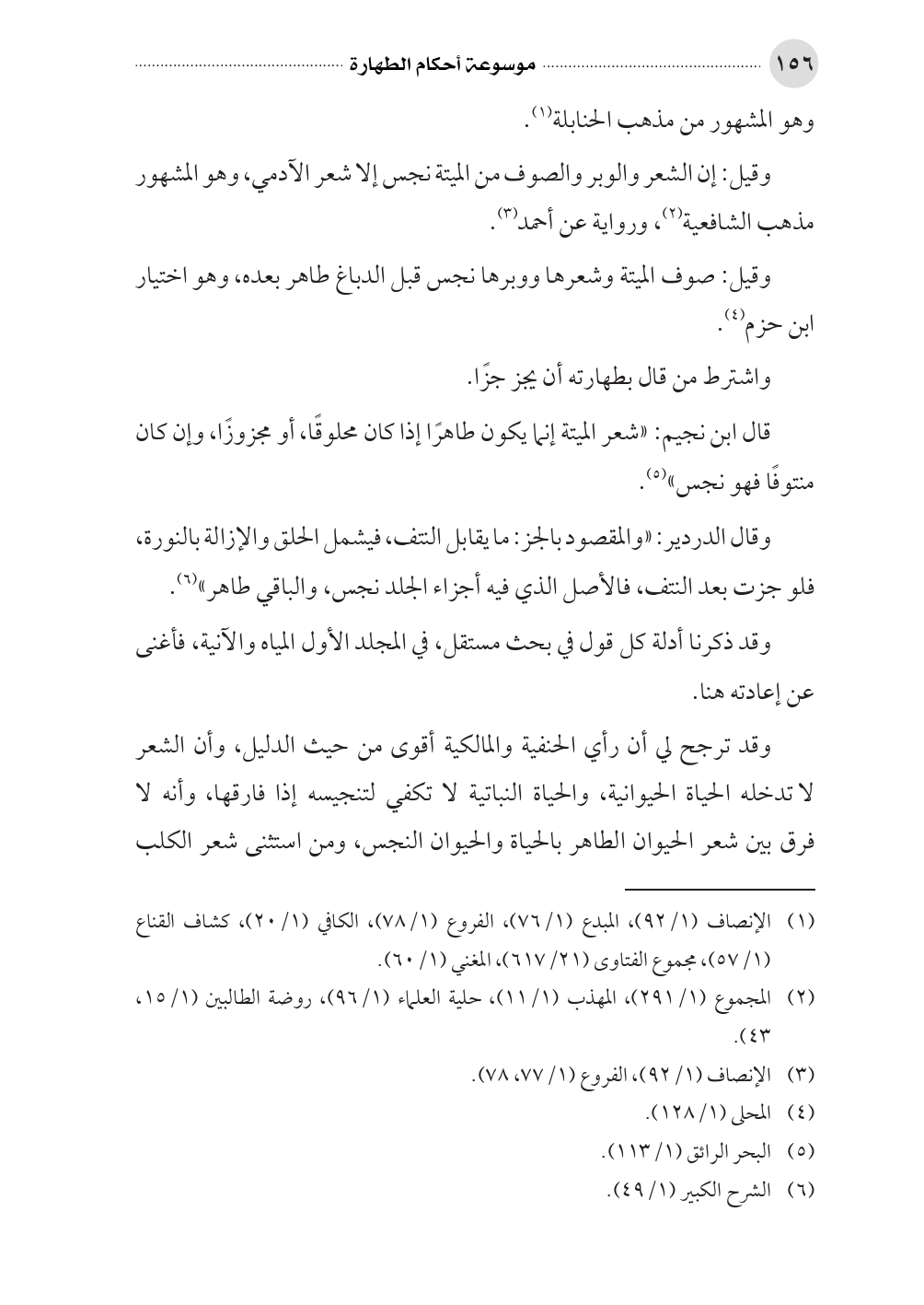 وقد ترجح لي أن رأي الحنفية والمالكية أقوى من حيث الدليل، وأن الشعر لا تدخله الحياة الحيوانية، والحياة النباتية لا تكفي لتنجيسه إذا فارقها، وأنه لا فرق بين شعر الحيوان الطاهر بالحياة والحيوان النجس، ومن استثنى شعر الكلب
