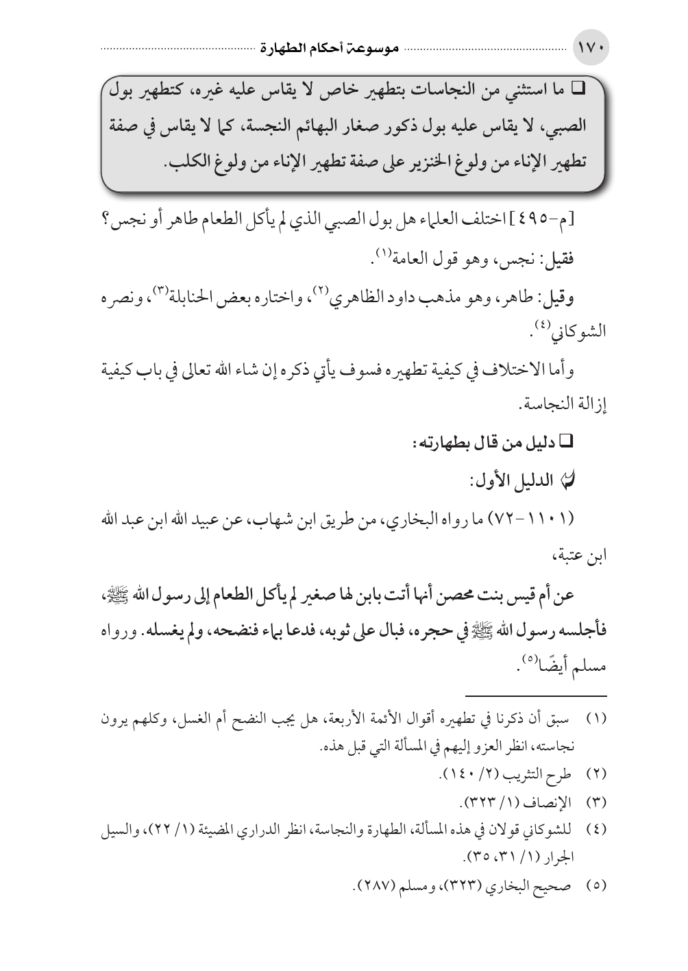 عن أم قيس بنت محصن أنها أتت بابن لها صغير لم يأكل الطعام إلى رسول الله صلى الله عليه وسلم، فأجلسه رسول الله صلى الله عليه وسلم في حجره، فبال على ثوبه، فدعا بماء فنضحه، ولم يغسله. ورواه مسلم أيضًا (¬٥).