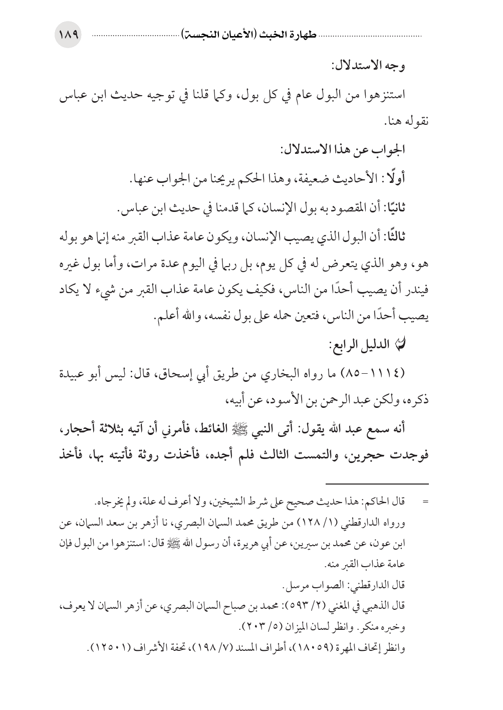 ثالثًا: أن البول الذي يصيب الإنسان، ويكون عامة عذاب القبر منه إنما هو بوله هو، وهو الذي يتعرض له في كل يوم، بل ربما في اليوم عدة مرات، وأما بول غيره فيندر أن يصيب أحدًا من الناس، فكيف يكون عامة عذاب القبر من شيء لا يكاد يصيب أحدًا من الناس، فتعين حمله على بول نفسه، والله أعلم.