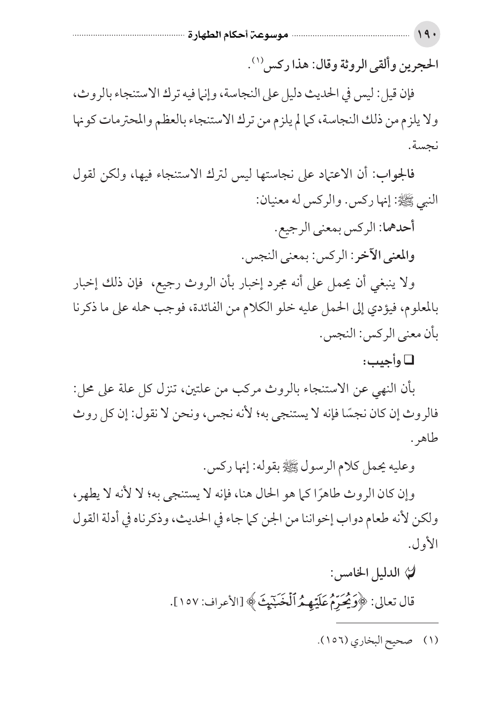 وإن كان الروث طاهرًا كما هو الحال هنا، فإنه لا يستنجى به؛ لا لأنه لا يطهر، ولكن لأنه طعام دواب إخواننا من الجن كما جاء في الحديث، وذكرناه في أدلة القول الأول.