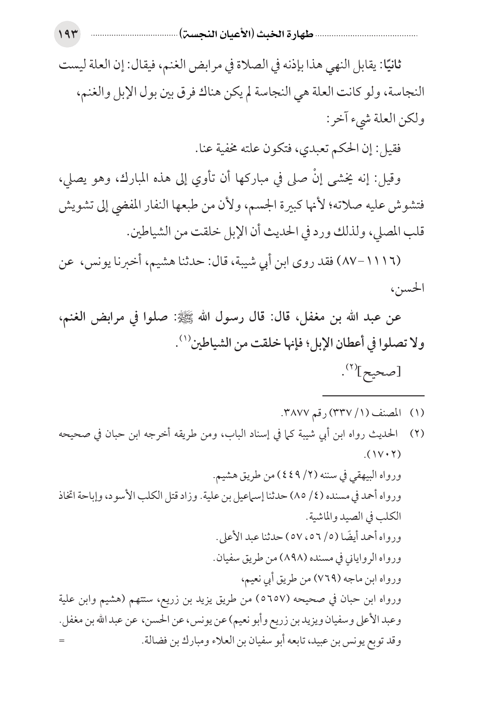 ثانيًا: يقابل النهي هذا بإذنه في الصلاة في مرابض الغنم، فيقال: إن العلة ليست النجاسة، ولو كانت العلة هي النجاسة لم يكن هناك فرق بين بول الإبل والغنم، ولكن العلة شيء آخر: