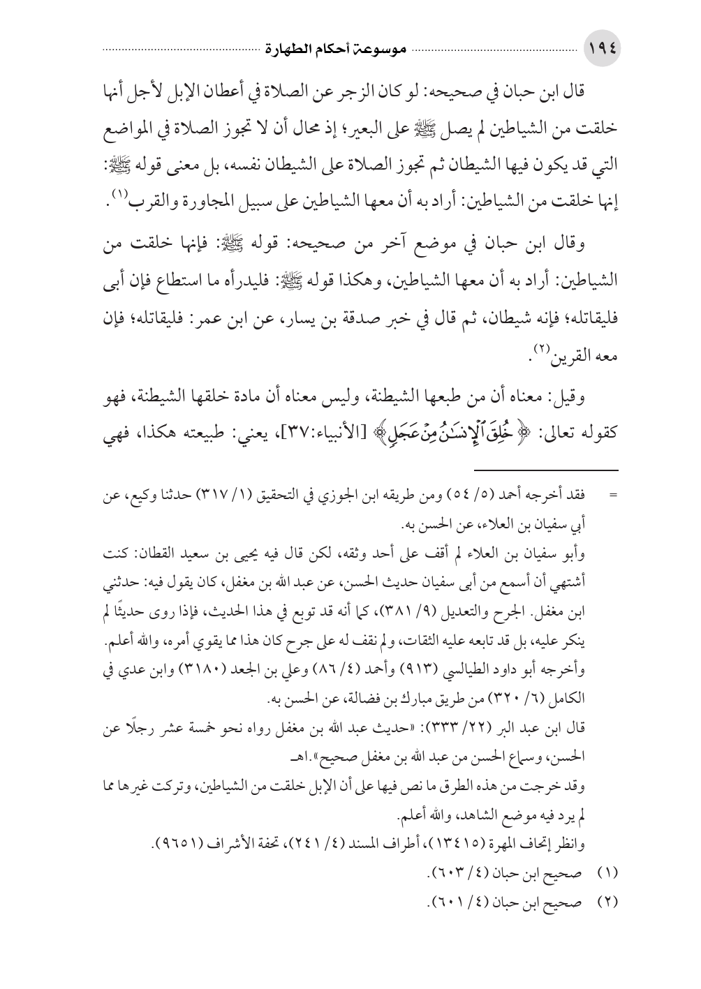 قال ابن حبان في صحيحه: لو كان الزجر عن الصلاة في أعطان الإبل لأجل أنها خلقت من الشياطين لم يصل صلى الله عليه وسلم على البعير؛ إذ محال أن لا تجوز الصلاة في المواضع التي قد يكون فيها الشيطان ثم تجوز الصلاة على الشيطان نفسه، بل معنى قوله صلى الله عليه وسلم: إنها خلقت من الشياطين: أراد به أن معها الشياطين على سبيل المجاورة والقرب (¬١).