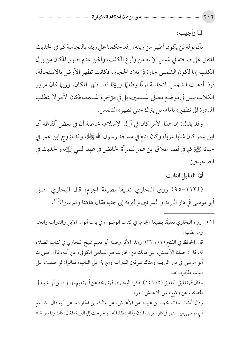 بأن بوله لن يكون أطهر من ريقه، وقد حكمنا على ريقه بالنجاسة كما في الحديث المتفق على صحته في غسل الإناء من ولوغ الكلب، ولكن عدم تطهير المكان من بول الكلب إما لكون الشمس حارة في بلاد الحجاز، فكانت تطهر الأرض بالاستحالة، فإذا أذهبت الشمس النجاسة لونًا وطعمًا وريحًا فقد طهر المكان، وربما كان مرور الكلاب ليس في موضع مصلى المسلمين، بل في مؤخرة المسجد، فكان الأمر لا يتطلب المبادرة إلى تطهيره بالماء، بل يترك حتى تطهره الشمس.