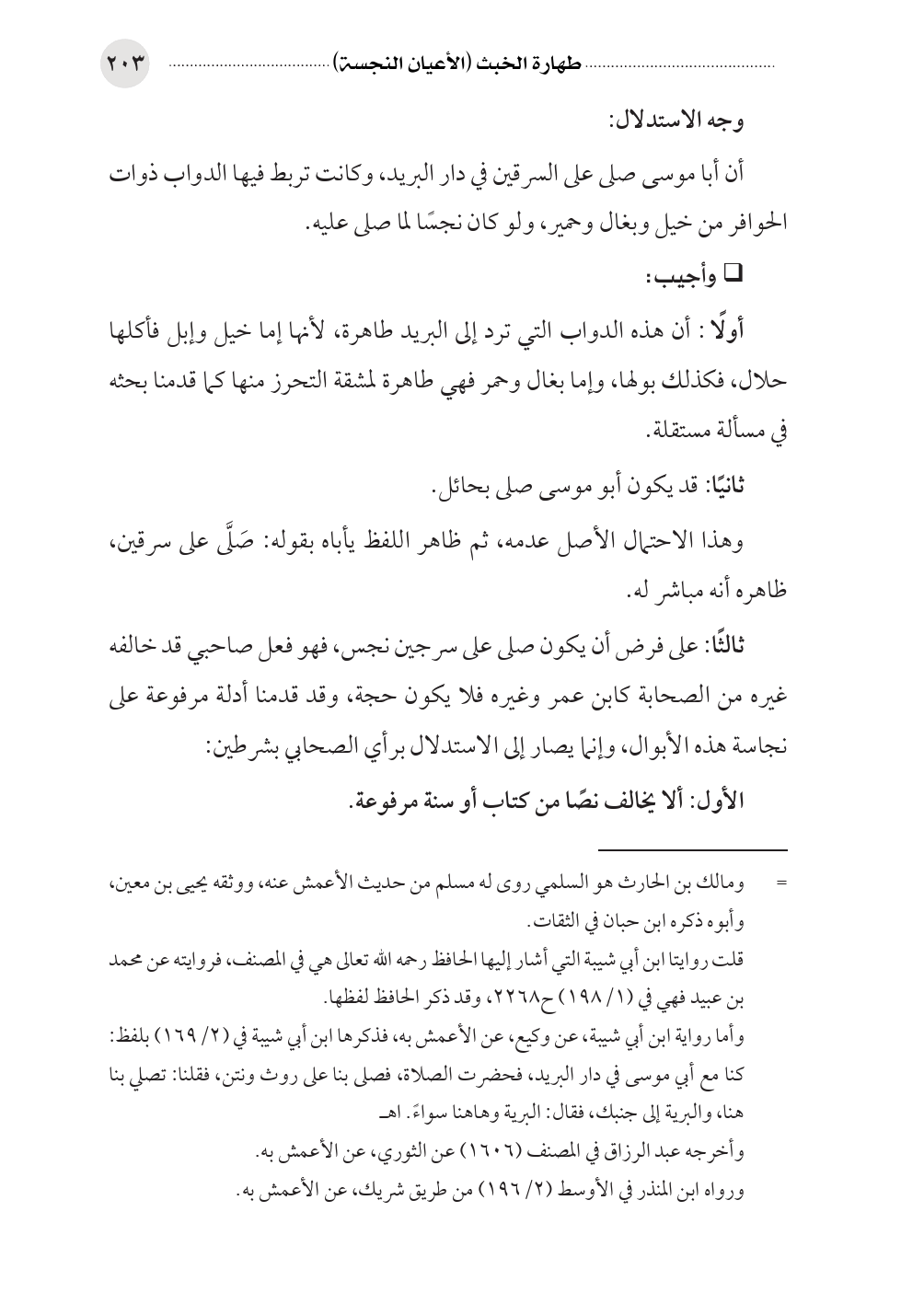 ثالثًا: على فرض أن يكون صلى على سرجين نجس، فهو فعل صاحبي قد خالفه غيره من الصحابة كابن عمر وغيره فلا يكون حجة، وقد قدمنا أدلة مرفوعة على نجاسة هذه الأبوال، وإنما يصار إلى الاستدلال برأي الصحابي بشرطين: