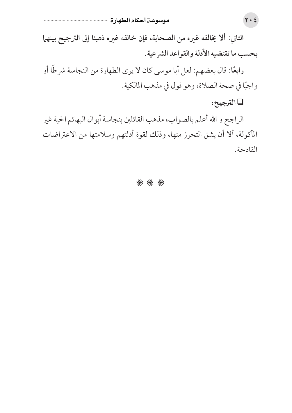 الراجح والله أعلم بالصواب، مذهب القائلين بنجاسة أبوال البهائم الحية غير المأكولة، ألا أن يشق التحرز منها، وذلك لقوة أدلتهم وسلامتها من الاعتراضات القادحة.