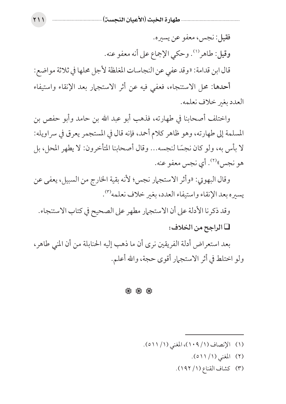 وقال البهوتي: «وأثر الاستجمار نجس؛ لأنه بقية الخارج من السبيل، يعفى عن يسيره بعد الإنقاء واستيفاء العدد، بغير خلاف نعلمه (¬٣).