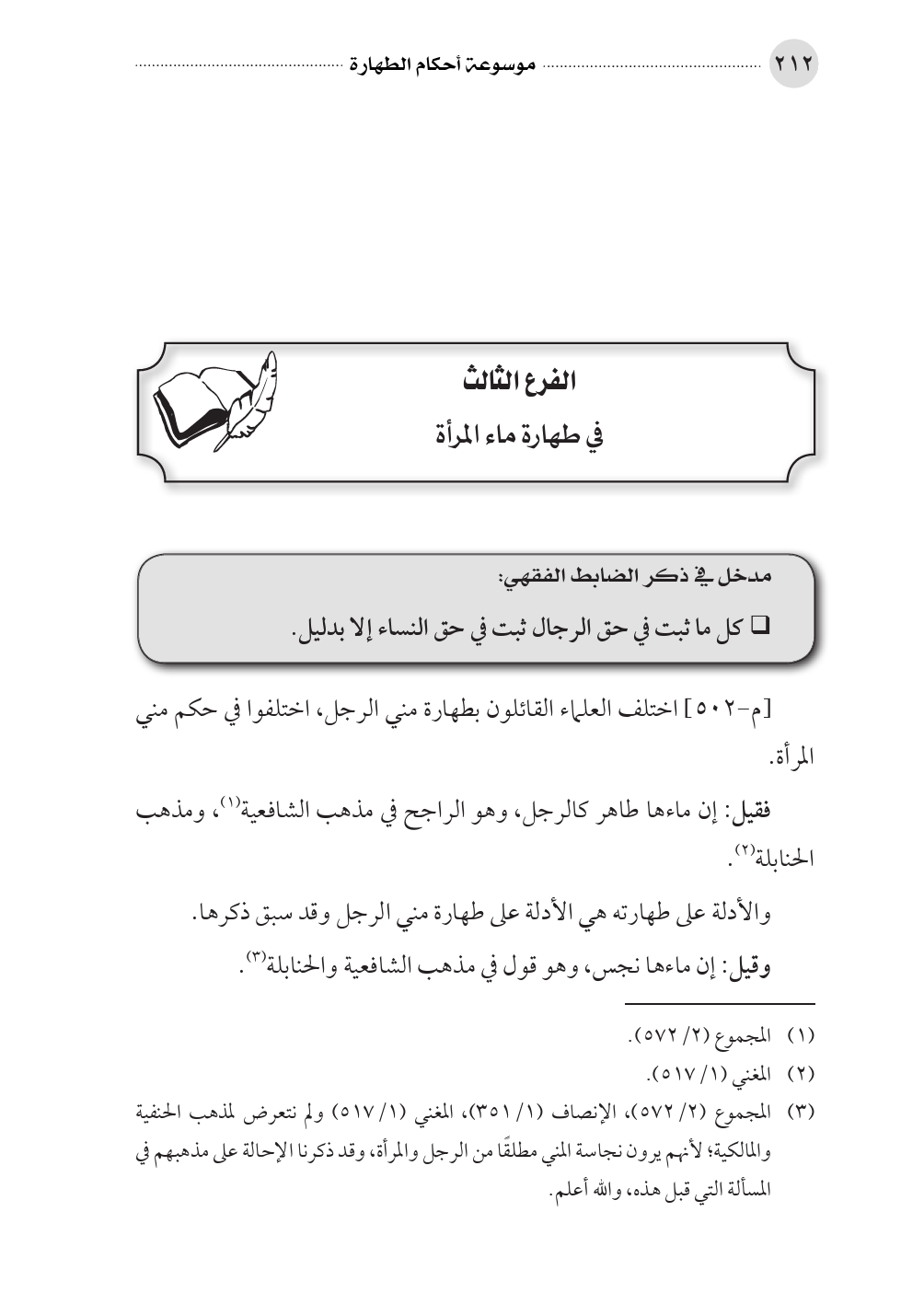 (¬٣) المجموع (٢/ ٥٧٢)، الإنصاف (١/ ٣٥١)، المغني (١/ ٥١٧) ولم نتعرض لمذهب الحنفية والمالكية؛ لأنهم يرون نجاسة المني مطلقًا من الرجل والمرأة، وقد ذكرنا الإحالة على مذهبهم في المسألة التي قبل هذه، والله أعلم.