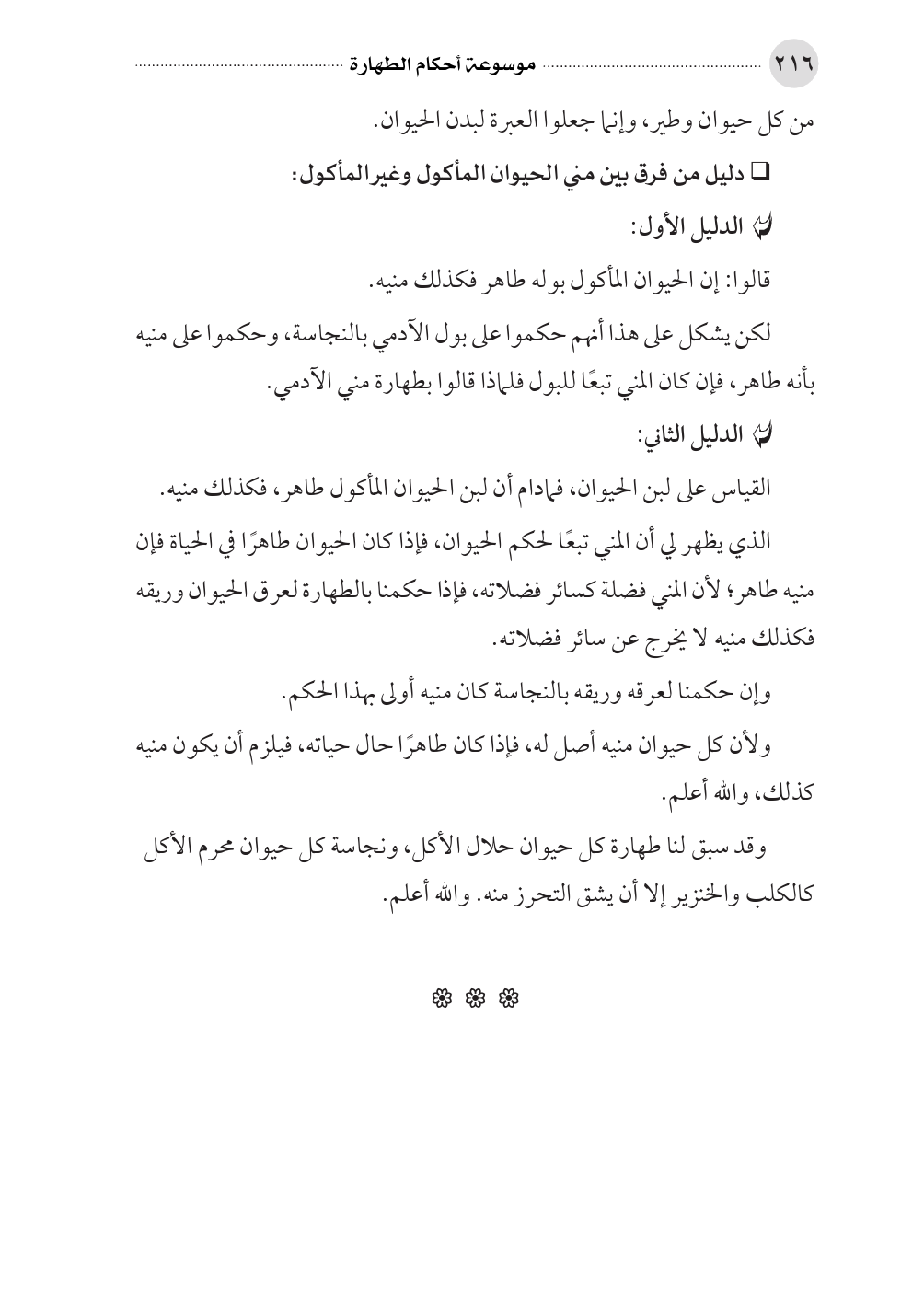 ولأن كل حيوان منيه أصل له، فإذا كان طاهرًا حال حياته، فيلزم أن يكون منيه كذلك، والله أعلم.