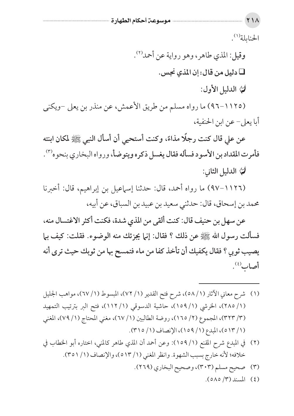 (¬٢) في المبدع شرح المقنع (١/ ١٥٩): وعن أحمد أن المذي طاهر كالمني، اختاره أبو الخطاب في خلافه؛ لأنه خارج بسبب الشهوة. وانظر المغني (١/ ٥١٣)، والإنصاف (١/ ٣٥١).