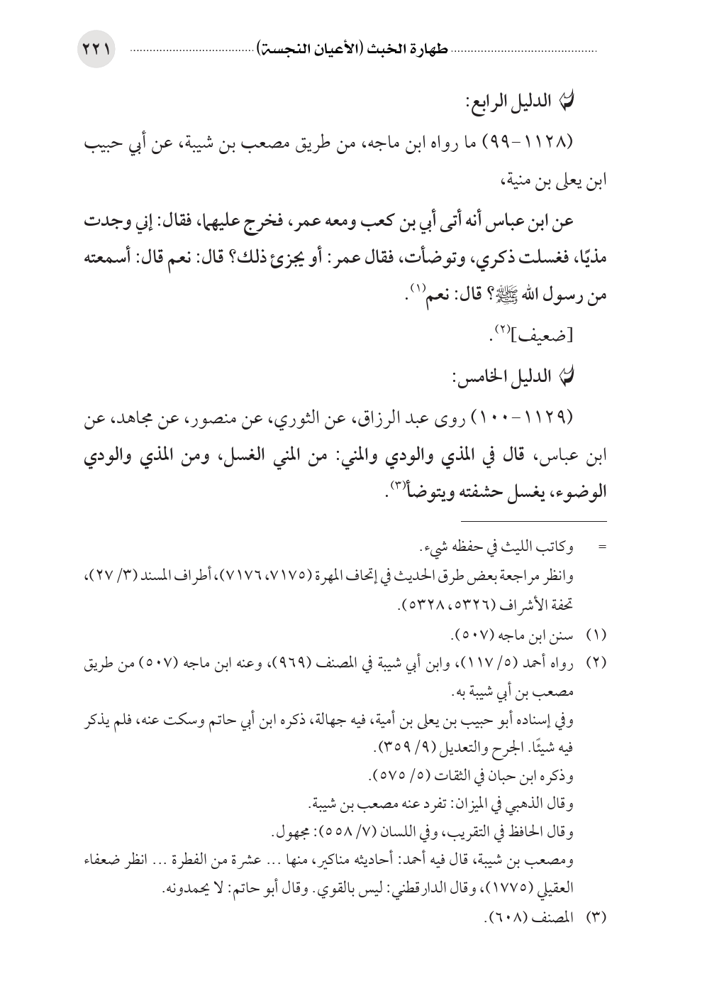 (١١٢٨ - ٩٩) ما رواه ابن ماجه، من طريق مصعب بن شيبة، عن أبي حبيب ابن يعلى بن منية،