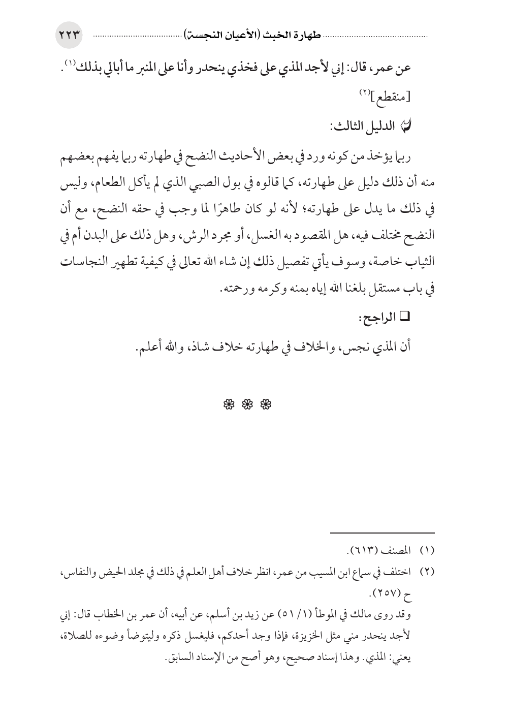 وقد روى مالك في الموطأ (١/ ٥١) عن زيد بن أسلم، عن أبيه، أن عمر بن الخطاب قال: إني لأجد ينحدر مني مثل الخزيزة، فإذا وجد أحدكم، فليغسل ذكره وليتوضأ وضوءه للصلاة، يعني: المذي. وهذا إسناد صحيح، وهو أصح من الإسناد السابق.