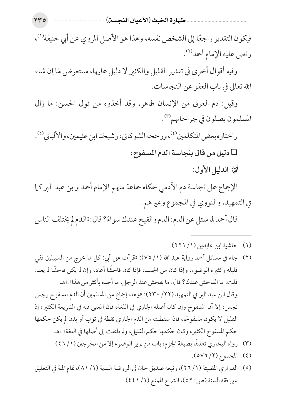 وقال ابن عبد البر في التمهيد (٢٢/ ٢٣٠): «وهذا إجماع من المسلمين أن الدم المسفوح رجس نجس، إلا أن المسفوح وإن كان أصله الجاري في اللغة، فإن المعنى فيه في الشريعة الكثير، إذ القليل لا يكون مسفوحًا، فإذا سقطت من الدم الجاري نقطة في ثوب أو بدن لم يكن حكمها حكم المسفوح الكثير، وكان حكمها حكم القليل، ولم يلتفت إلى أصلها في اللغة».اهـ