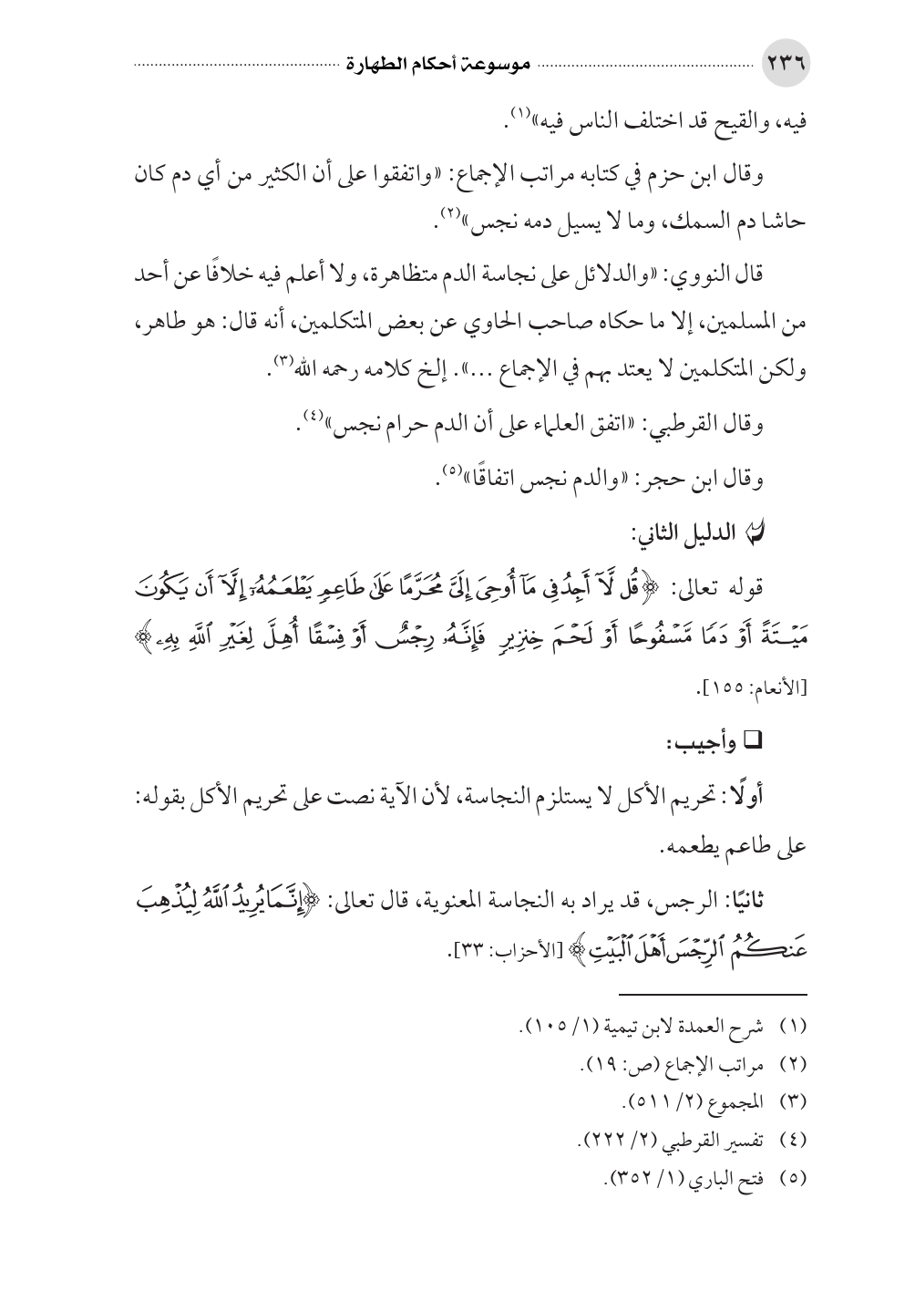 قال النووي: «والدلائل على نجاسة الدم متظاهرة، ولا أعلم فيه خلافًا عن أحد من المسلمين، إلا ما حكاه صاحب الحاوي عن بعض المتكلمين، أنه قال: هو طاهر، ولكن المتكلمين لا يعتد بهم في الإجماع ... ». إلخ كلامه رحمه الله (¬٣).