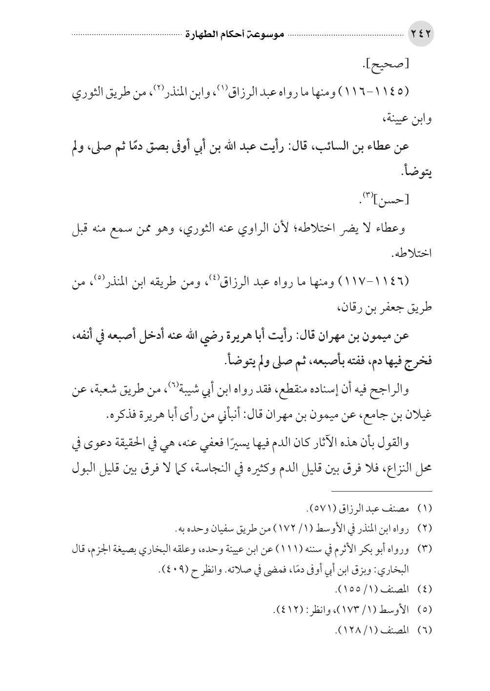 عن ميمون بن مهران قال: رأيت أبا هريرة رضي الله عنه أدخل أصبعه في أنفه، فخرج فيها دم، ففته بأصبعه، ثم صلى ولم يتوضأ.
