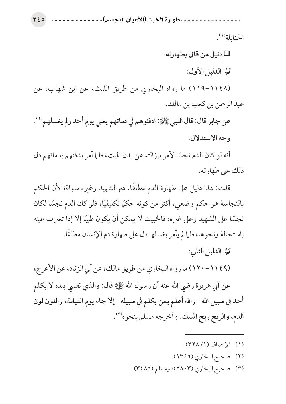 قلت: هذا دليل على طهارة الدم مطلقًا، دم الشهيد وغيره سواءً؛ لأن الحكم بالنجاسة هو حكم وضعي، أكثر من كونه حكمًا تكليفيًا، فلو كان الدم نجسًا لكان نجسًا على الشهيد وعلى غيره، فالخبيث لا يمكن أن يكون طيبًا إلا إذا تغيرت عينه باستحالة ونحوها، فلما لم يأمر بغسلها دل على طهارة دم الإنسان مطلقًا.