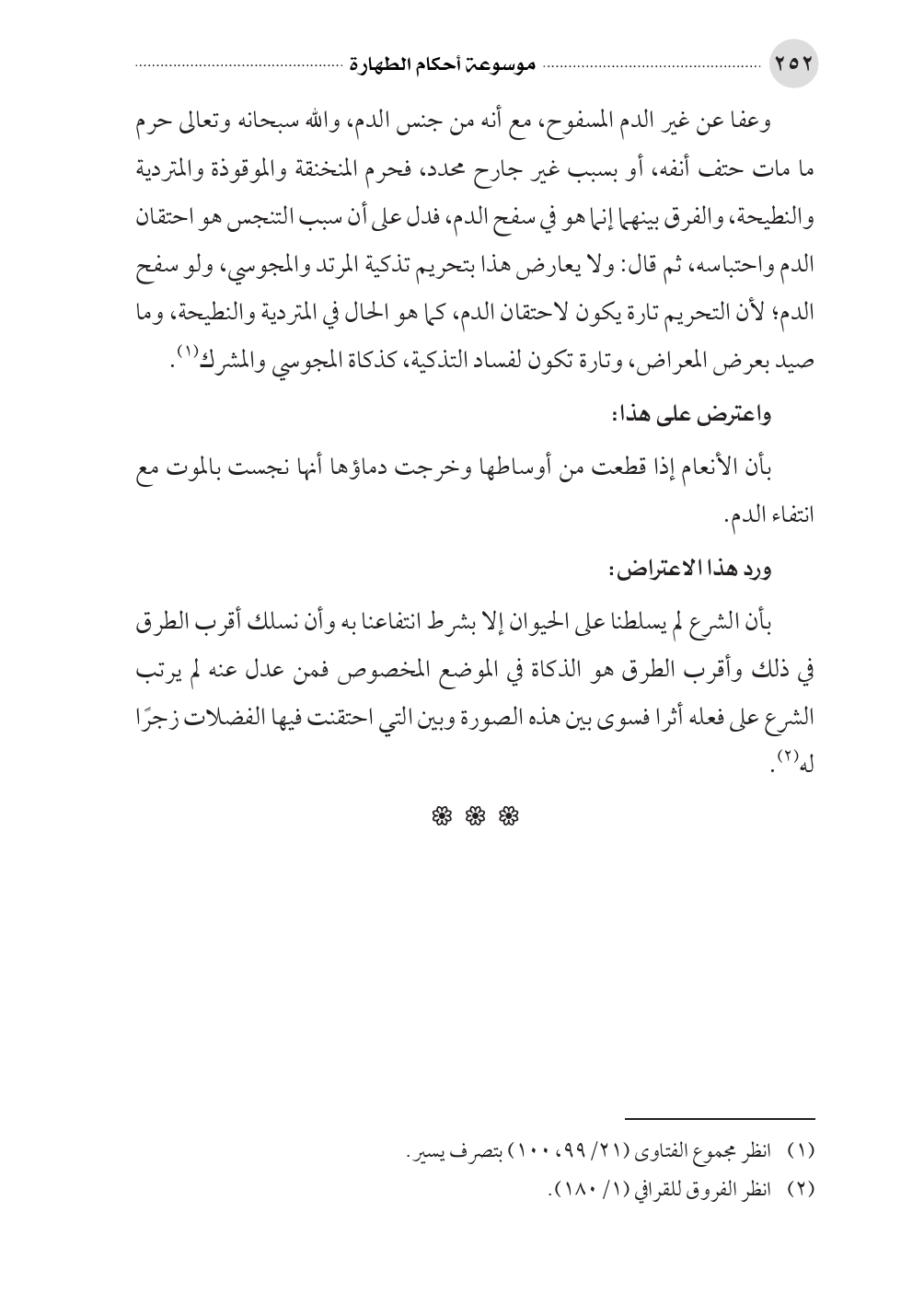 وعفا عن غير الدم المسفوح، مع أنه من جنس الدم، والله سبحانه وتعالى حرم ما مات حتف أنفه، أو بسبب غير جارح محدد، فحرم المنخنقة والموقوذة والمتردية والنطيحة، والفرق بينهما إنما هو في سفح الدم، فدل على أن سبب التنجس هو احتقان الدم واحتباسه، ثم قال: ولا يعارض هذا بتحريم تذكية المرتد والمجوسي، ولو سفح الدم؛ لأن التحريم تارة يكون لاحتقان الدم، كما هو الحال في المتردية والنطيحة، وما صيد بعرض المعراض، وتارة تكون لفساد التذكية، كذكاة المجوسي والمشرك (¬١).