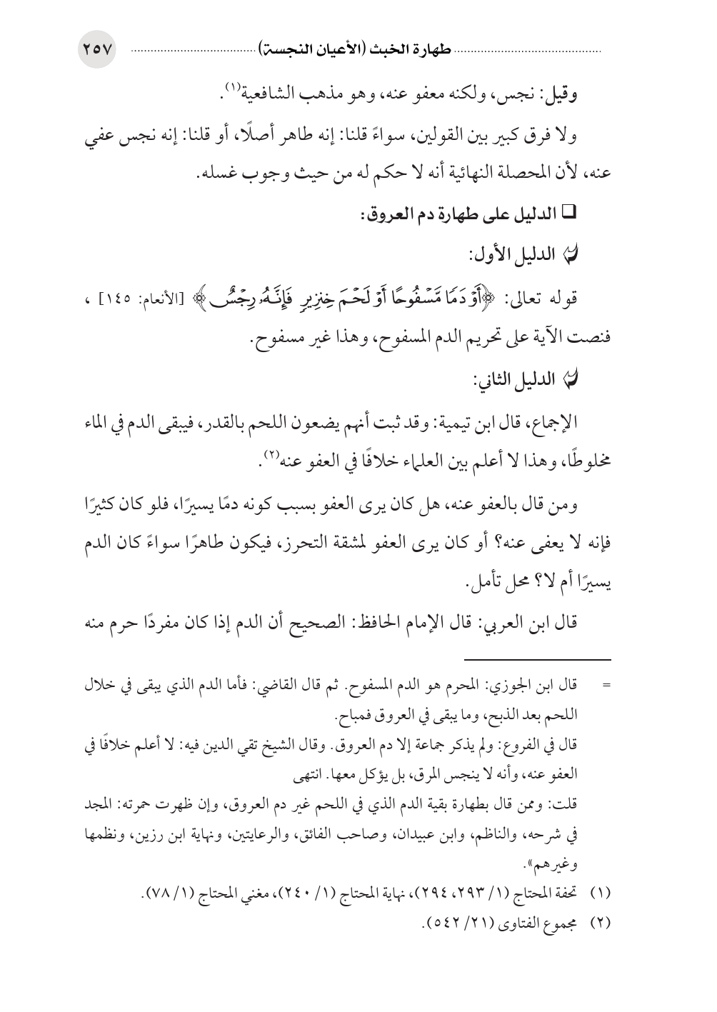 الإجماع، قال ابن تيمية: وقد ثبت أنهم يضعون اللحم بالقدر، فيبقى الدم في الماء مخلوطًا، وهذا لا أعلم بين العلماء خلافًا في العفو عنه (¬٢).