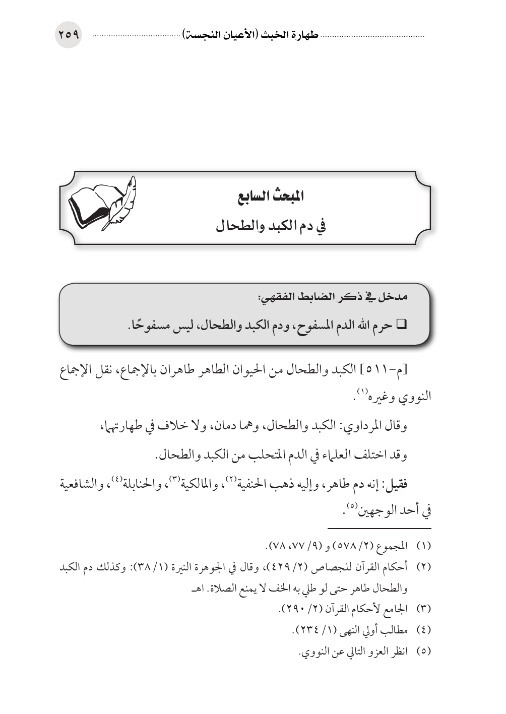 (¬٢) أحكام القرآن للجصاص (٢/ ٤٢٩)، وقال في الجوهرة النيرة (١/ ٣٨): وكذلك دم الكبد والطحال طاهر حتى لو طلي به الخف لا يمنع الصلاة. اهـ