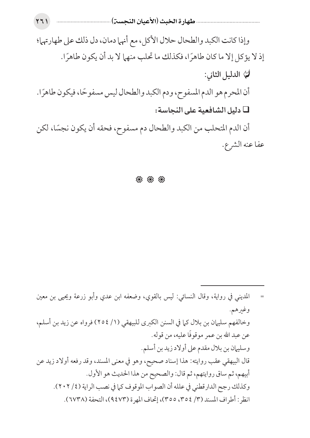 وإذا كانت الكبد والطحال حلال الأكل، مع أنهما دمان، دل ذلك على طهارتهما؛ إذ لا يؤكل إلا ما كان طاهرًا، فكذلك ما تحلب منهما لا بد أن يكون طاهرًا.