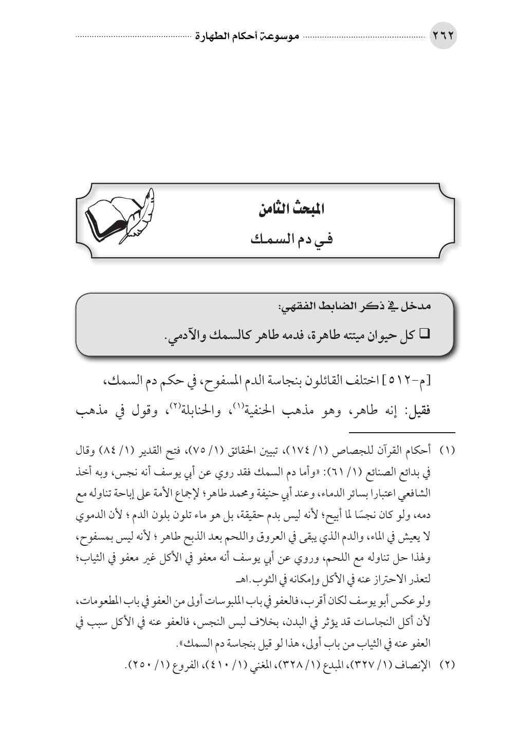 (¬١) أحكام القرآن للجصاص (١/ ١٧٤)، تبيين الحقائق (١/ ٧٥)، فتح القدير (١/ ٨٤) وقال في بدائع الصنائع (١/ ٦١): «وأما دم السمك فقد روي عن أبي يوسف أنه نجس، وبه أخذ الشافعي اعتبارا بسائر الدماء، وعند أبي حنيفة ومحمد طاهر؛ لإجماع الأمة على إباحة تناوله مع دمه، ولو كان نجسًا لما أبيح؛ لأنه ليس بدم حقيقة، بل هو ماء تلون بلون الدم؛ لأن الدموي لا يعيش في الماء، والدم الذي يبقى في العروق واللحم بعد الذبح طاهر؛ لأنه ليس بمسفوح، ولهذا حل تناوله مع اللحم، وروي عن أبي يوسف أنه معفو في الأكل غير معفو في الثياب؛ لتعذر الاحتراز عنه في الأكل وإمكانه في الثوب. اهـ