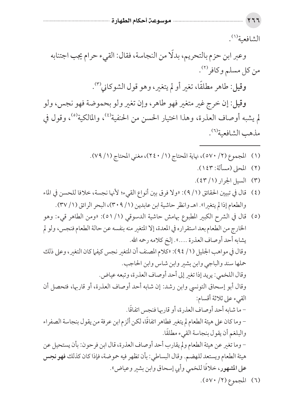 (¬٥) قال في الشرح الكبير المطبوع بهامش حاشية الدسوقي (١/ ٥١): «ومن الطاهر قيء: وهو الخارج من الطعام بعد استقراره في المعدة، إلا المتغير منه بنفسه عن حالة الطعام فنجس، ولو لم يشابه أحد أوصاف العذرة .... ». إلخ كلامه رحمه الله.