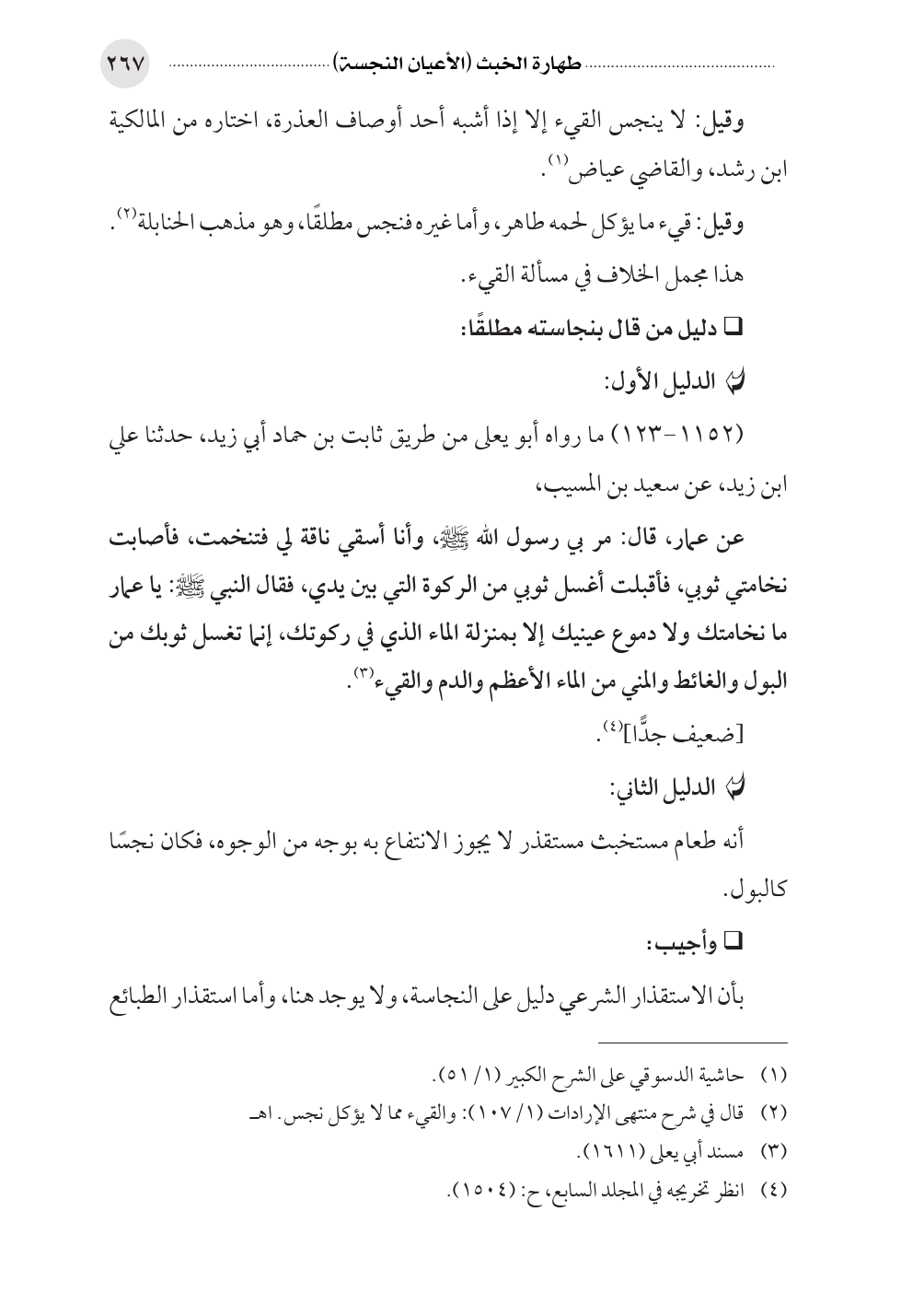 عن عمار، قال: مر بي رسول الله صلى الله عليه وسلم، وأنا أسقي ناقة لي فتنخمت، فأصابت نخامتي ثوبي، فأقبلت أغسل ثوبي من الركوة التي بين يدي، فقال النبي صلى الله عليه وسلم: يا عمار ما نخامتك ولا دموع عينيك إلا بمنزلة الماء الذي في ركوتك، إنما تغسل ثوبك من البول والغائط والمني من الماء الأعظم والدم والقيء (¬٣).