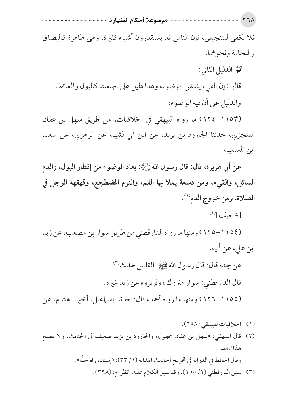 عن أبي هريرة، قال: قال رسول الله صلى الله عليه وسلم: يعاد الوضوء من إقطار البول، والدم السائل، والقيء، ومن دسعة يملأ بها الفم، والنوم المضطجع، وقهقهة الرجل في الصلاة، ومن خروج الدم (¬١).