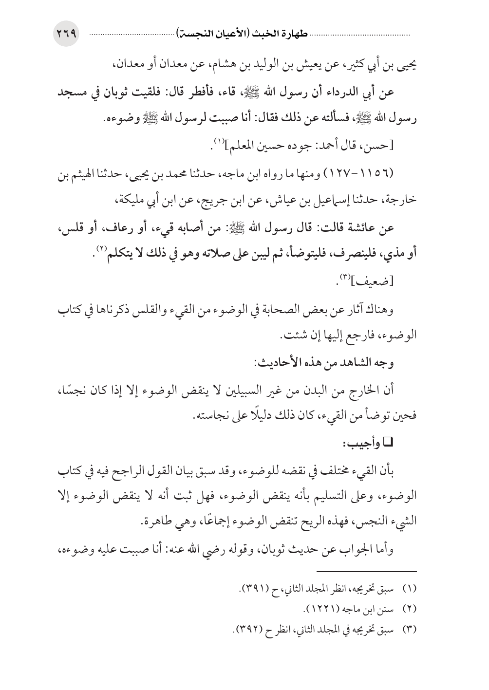 بأن القيء مختلف في نقضه للوضوء، وقد سبق بيان القول الراجح فيه في كتاب الوضوء، وعلى التسليم بأنه ينقض الوضوء، فهل ثبت أنه لا ينقض الوضوء إلا الشيء النجس، فهذه الريح تنقض الوضوء إجماعًا، وهي طاهرة.