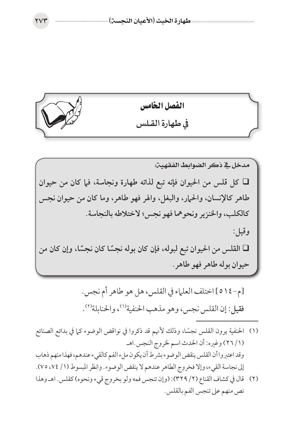 • كل قلس من الحيوان فإنه تبع لذاته طهارة ونجاسة، فما كان من حيوان طاهر كالإنسان، والحمار، والبغل، والهر فهو طاهر، وما كان من حيوان نجس كالكلب، والخنزير ونحوهما فهو نجس؛ لاختلاطه بالنجاسة.