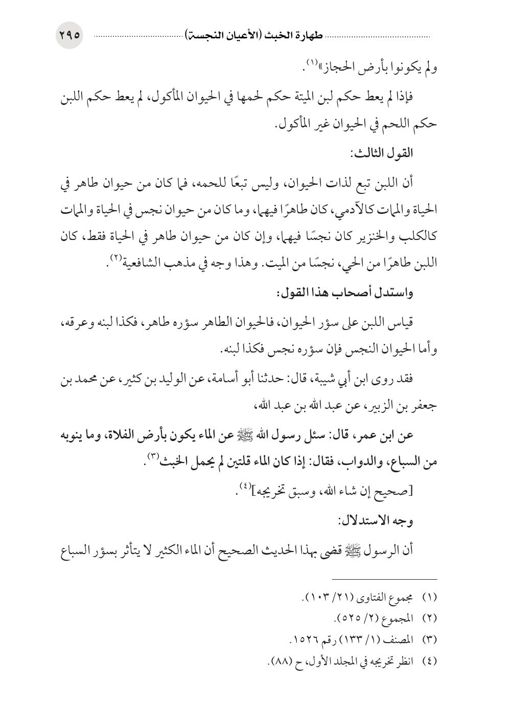 عن ابن عمر، قال: سئل رسول الله صلى الله عليه وسلم عن الماء يكون بأرض الفلاة، وما ينوبه من السباع، والدواب، فقال: إذا كان الماء قلتين لم يحمل الخبث (¬٣).