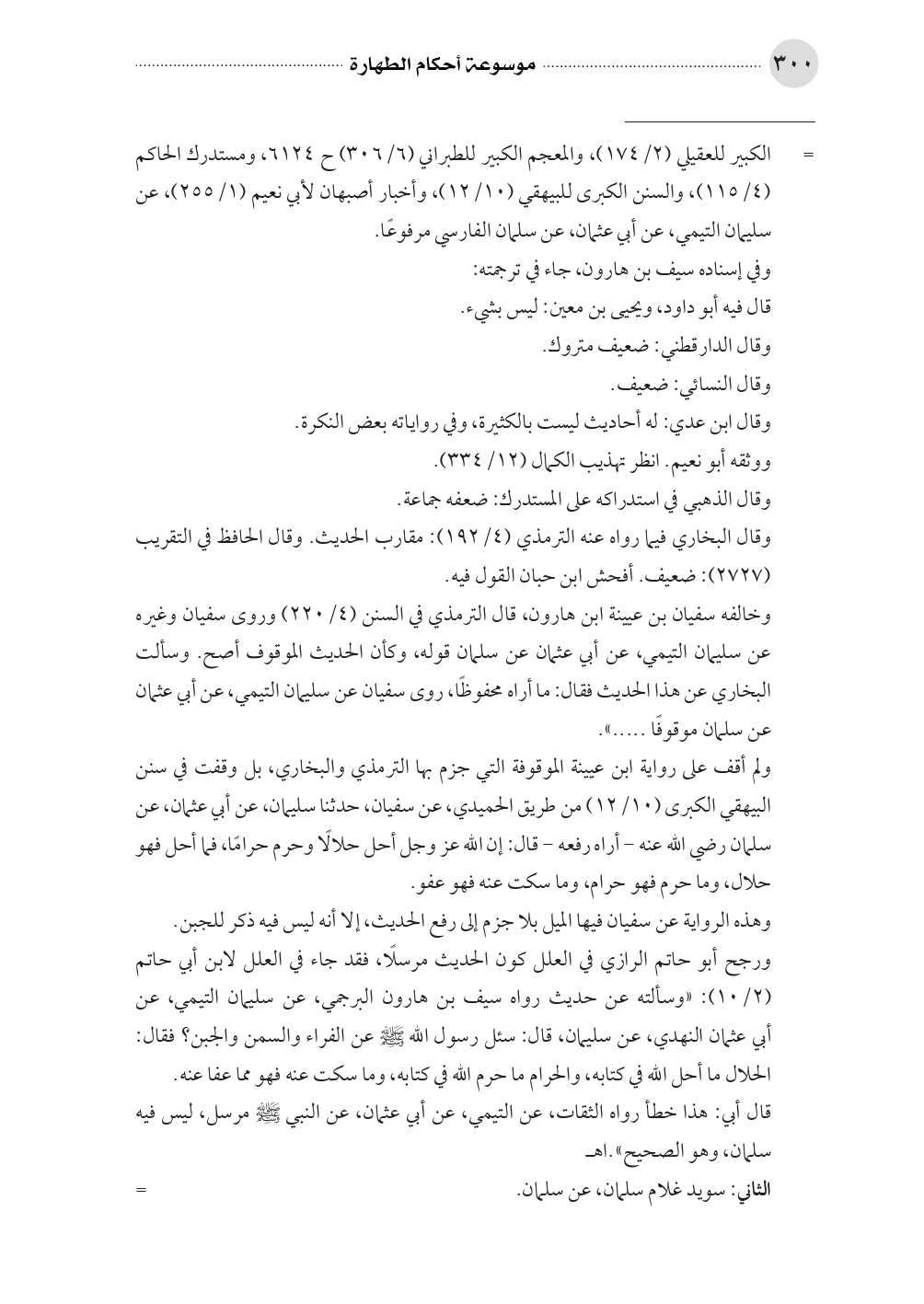 ورجح أبو حاتم الرازي في العلل كون الحديث مرسلًا، فقد جاء في العلل لابن أبي حاتم (٢/ ١٠): «وسألته عن حديث رواه سيف بن هارون البرجمي، عن سليمان التيمي، عن أبي عثمان النهدي، عن سليمان، قال: سئل رسول الله صلى الله عليه وسلم عن الفراء والسمن والجبن؟ فقال: الحلال ما أحل الله في كتابه، والحرام ما حرم الله في كتابه، وما سكت عنه فهو مما عفا عنه.