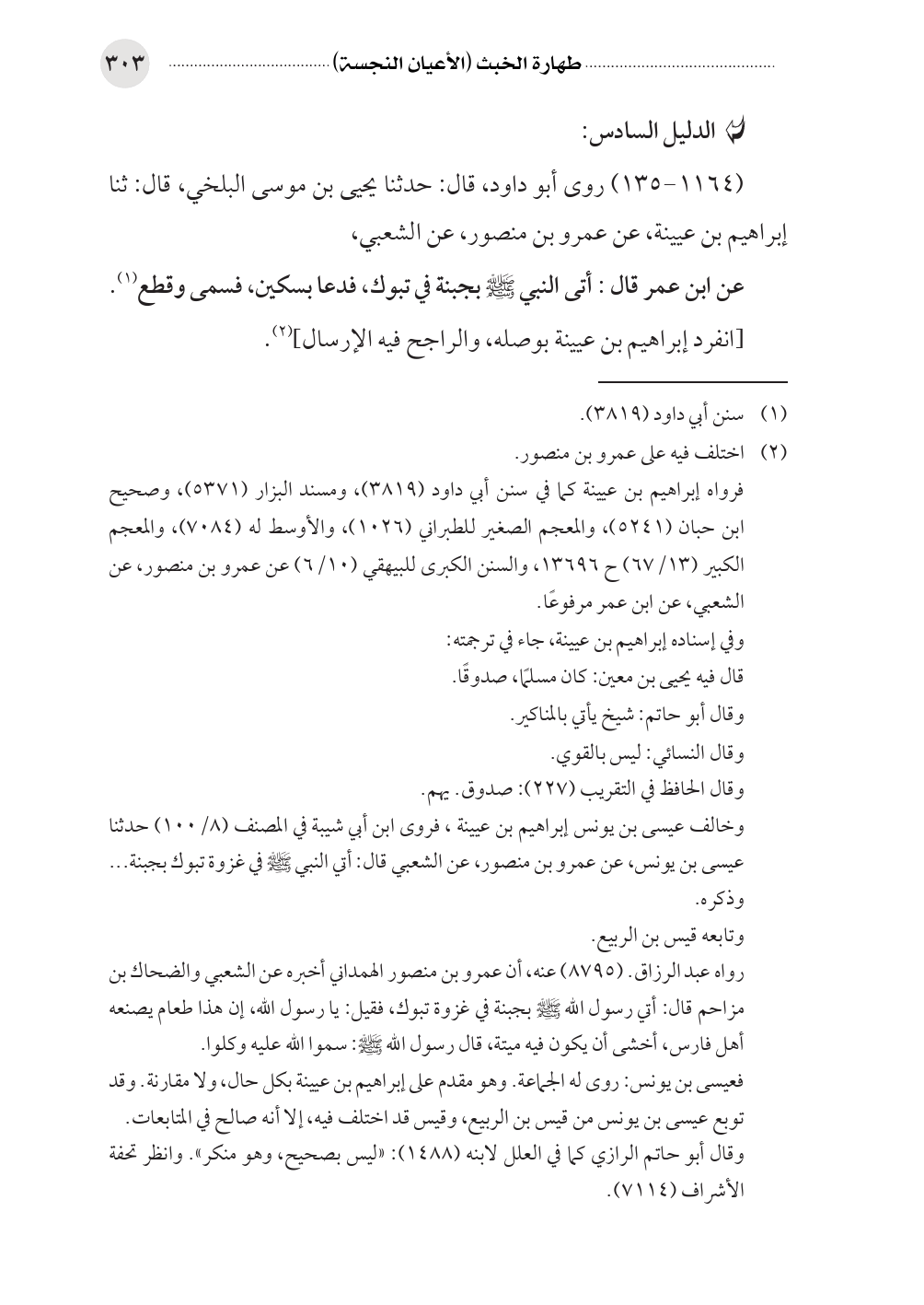 (١١٦٤ - ١٣٥) روى أبو داود، قال: حدثنا يحيى بن موسى البلخي، قال: ثنا إبراهيم بن عيينة، عن عمرو بن منصور، عن الشعبي، عن ابن عمر قال: أتى النبي صلى الله عليه وسلم بجبنة في تبوك، فدعا بسكين، فسمى وقطع (¬١).