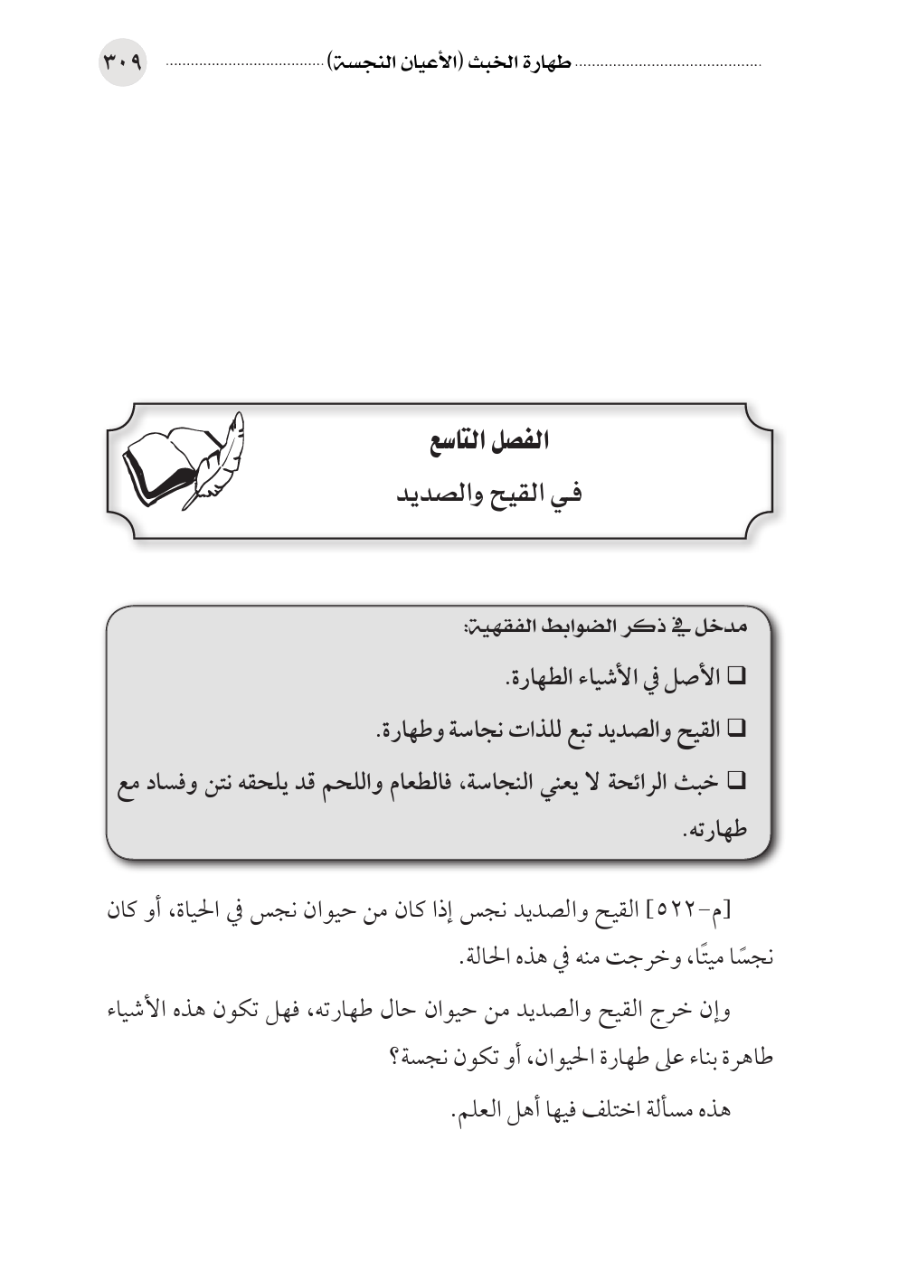 [م-٥٢٢] القيح والصديد نجس إذا كان من حيوان نجس في الحياة، أو كان نجسًا ميتًا، وخرجت منه في هذه الحالة.