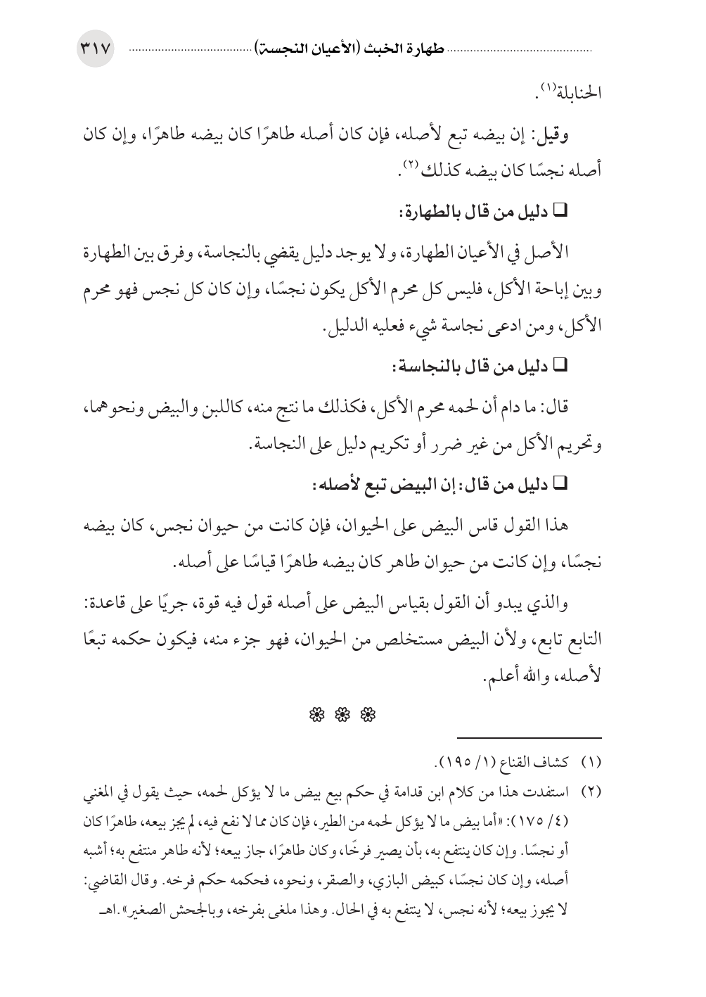 والذي يبدو أن القول بقياس البيض على أصله قول فيه قوة، جريًا على قاعدة: التابع تابع، ولأن البيض مستخلص من الحيوان، فهو جزء منه، فيكون حكمه تبعًا لأصله، والله أعلم.